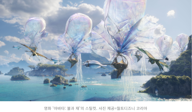 속으로 절망하며 또다시 고민했습니다. 내가 너무 예민한 걸까? 일찍 티켓팅하면 원래 이런 걸 감수해야 하나? 결국 이번에도 자리를 옮겼어요. 마침 3D 안경에 흠집이 나서 교체하러 나갔다가, 자연스럽게 앞 좌석에 안착했습니다. 다행히 광고 시간이었어요. 그리고 그 선택은 옳았어요. 아이맥스가 화면 크기로 압도한다면, 스크린 X는 시야를 편하게 확장시켜 줬습니다. 양옆까지 펼쳐지는 화면 덕분에 어지러움은 덜하고 몰입은 더 깊었거든요. 17,000원의 티켓값으로 경험한 제임스 카메론식 비주얼 축제. 하늘 부족들이 해파리 모양의 생명체를 타고 판도라의 하늘을 나는 장면, 주인공이 거대 붉은 익룡 투르크를 타고 전투를 벌이는 장면, 툴쿤이 인간과 벌이는 바닷속 전투 장면 등 TV나 모바일 화면으로는 결코 대체할 수 없는 시각과 청각 도파민을 내뿜는 경이로운 경험이었습니다. 왜 친구가 꼭 영화관에서 보라고 강추했는지 이해가 됐습니다.