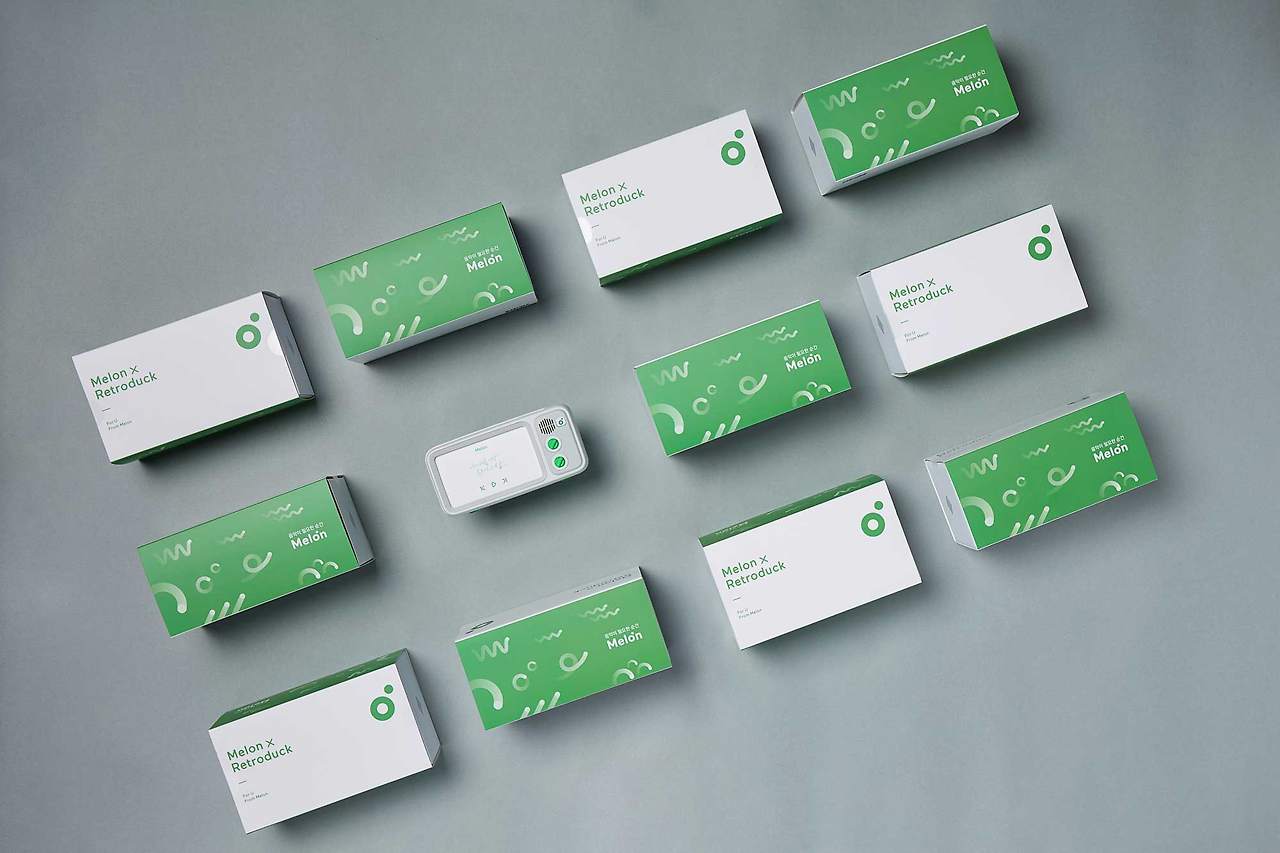 이번 콜라보를 진행하며 중점으로 둔 사항은 멜론의 상징적인 그린과 고도화를 진행하며 개발한 멜론 그래픽 그리고 레트로 덕과의 연결성이었습니다. 추가적으로 이번 콜라보를 통하여 새롭게 멜론만의 피규어를 개발하였는데 멜론의 로고와 서브 패턴을 사용하여 작업하였습니다. 피규어는 기존 3D 프린터를 이용해 초반에 테스트를 진행하였습니다. 그런데 일반 3D 프린터로 테스트한 목업을 양산형 3D 프린터로 진행한 결과 마감과 컬러 부분에서 저희가 기대하는 퀄리티가 나오지 않아 재료를 금속으로 변경하였고 재질도 레트로 덕 바디와 동일한 매트한 재질로 변경하여 최종 피규어를 완성하였습니다.