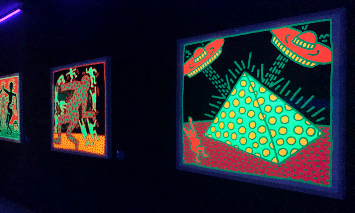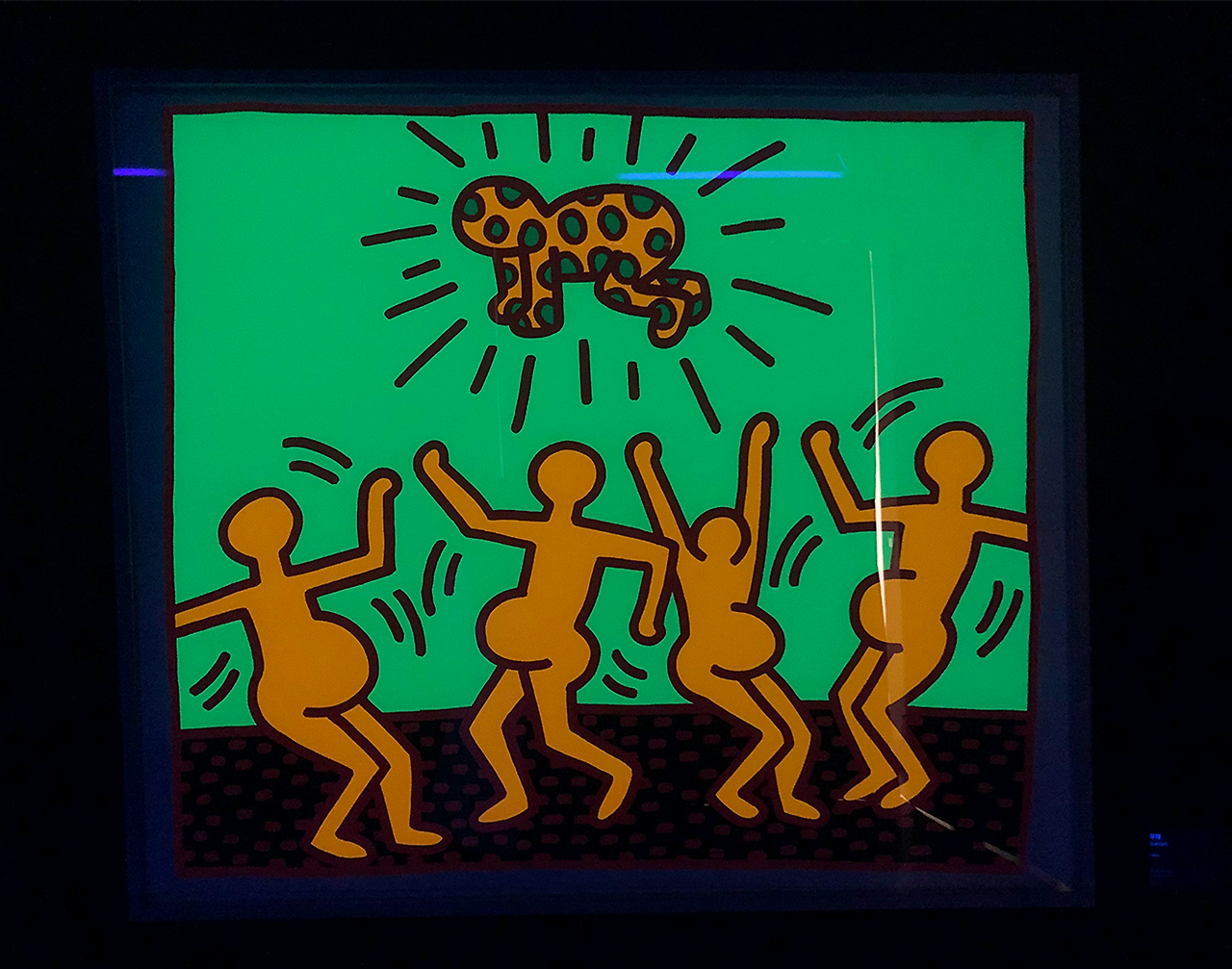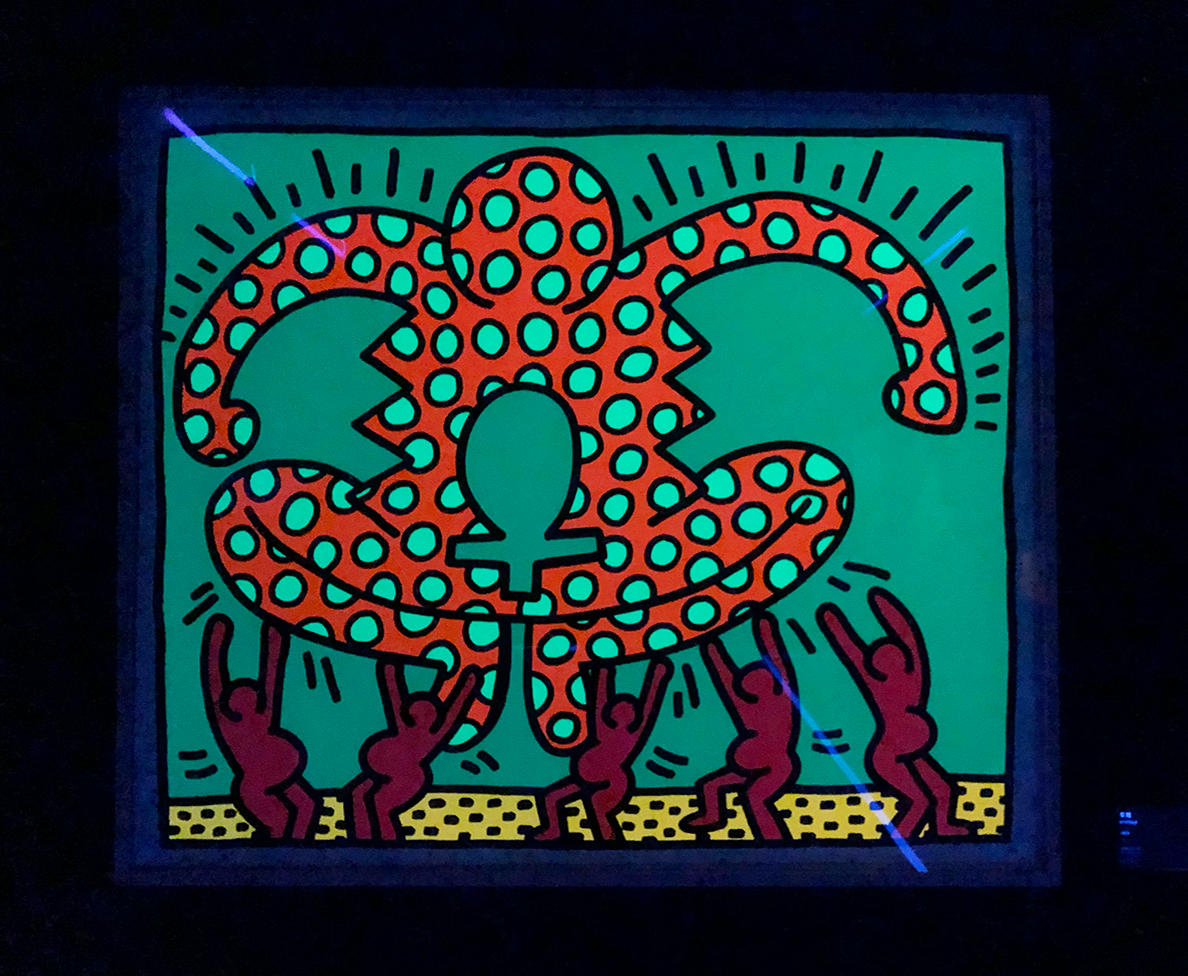 해링은 종종 블랙 라이트 아래에서 빛나는 형광색 컬러 페인트를 사용했습니다. 블랙 라이트는 1980년대 클럽 인테리어 장식으로 자주 사용되었고, 1984년 토니 샤프라지 갤러리에서 전시회를 가질 당시, 지하에 형광 물감으로 작업한 작품을 전시하고 DJ와 함께 밤새도록 댄스공연을 진행하기도 했습니다. 이 섹션에 들어왔을 때 환하게 웃으며 서로에게 형광빛 치아를 보여주는 분들도 계셨는데요. 보는 이들도 재밌게 감상할 수 있는 감각적인 공간이었습니다.