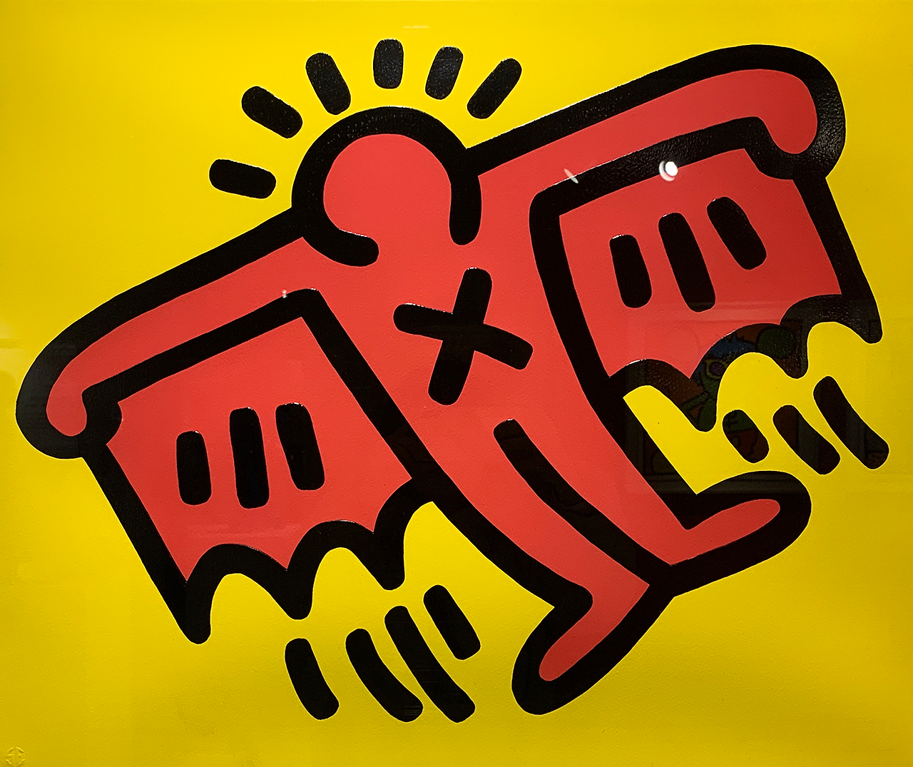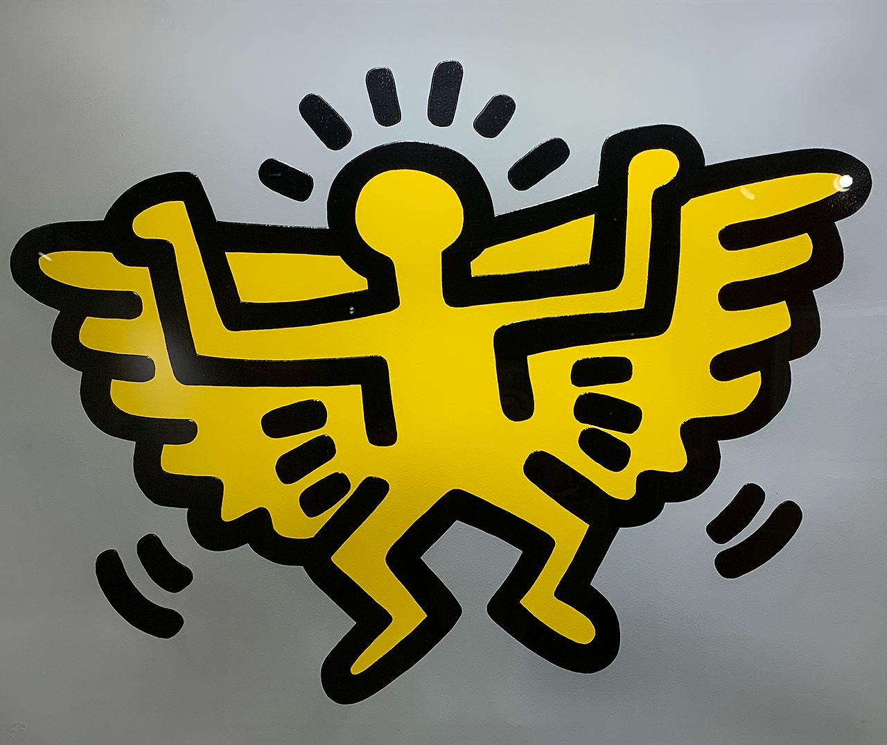 해링은 자주 비종교인의 시각에서 천국과 지옥이 과연 존재하는가에 대한 의견을 작품 속에 드러내곤 했는데요. <천사>는 영적인 존재, 수호자를 뜻할 뿐 아니라 우리 삶의 복잡함과 혼란을 상징하기도 합니다. <날개 달린 사람>은 가슴에 X자가 그려져 있는데 대부분 이 표시를 부정적인 상징으로 생각하지만, 성스러운 십자가, 신비스러운 어떤 것 등 다양한 의미를 상징하고 있습니다. <3개의 눈을 가진 얼굴>은 1982년에 개최된 첫 개인전 도록 표지에 그려졌습니다. 우스꽝스럽게 얼굴에 눈이 세 개 달린 형상은 탐욕이나 욕심을 가진 캐릭터로 보이기도 하지만, 해링은 이 그림에 대해 "어떤 특별한 의미는 없다"라고 이야기했다고 합니다.