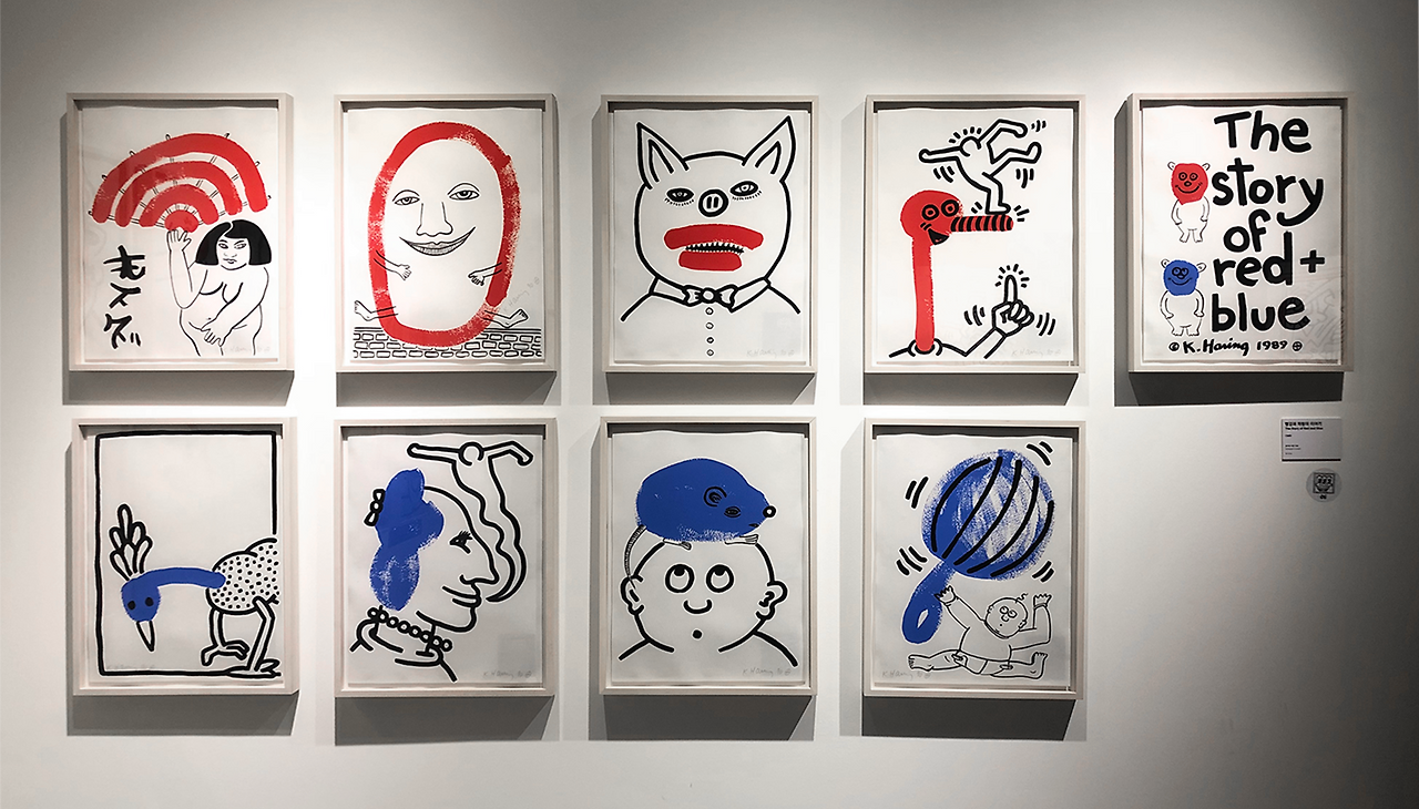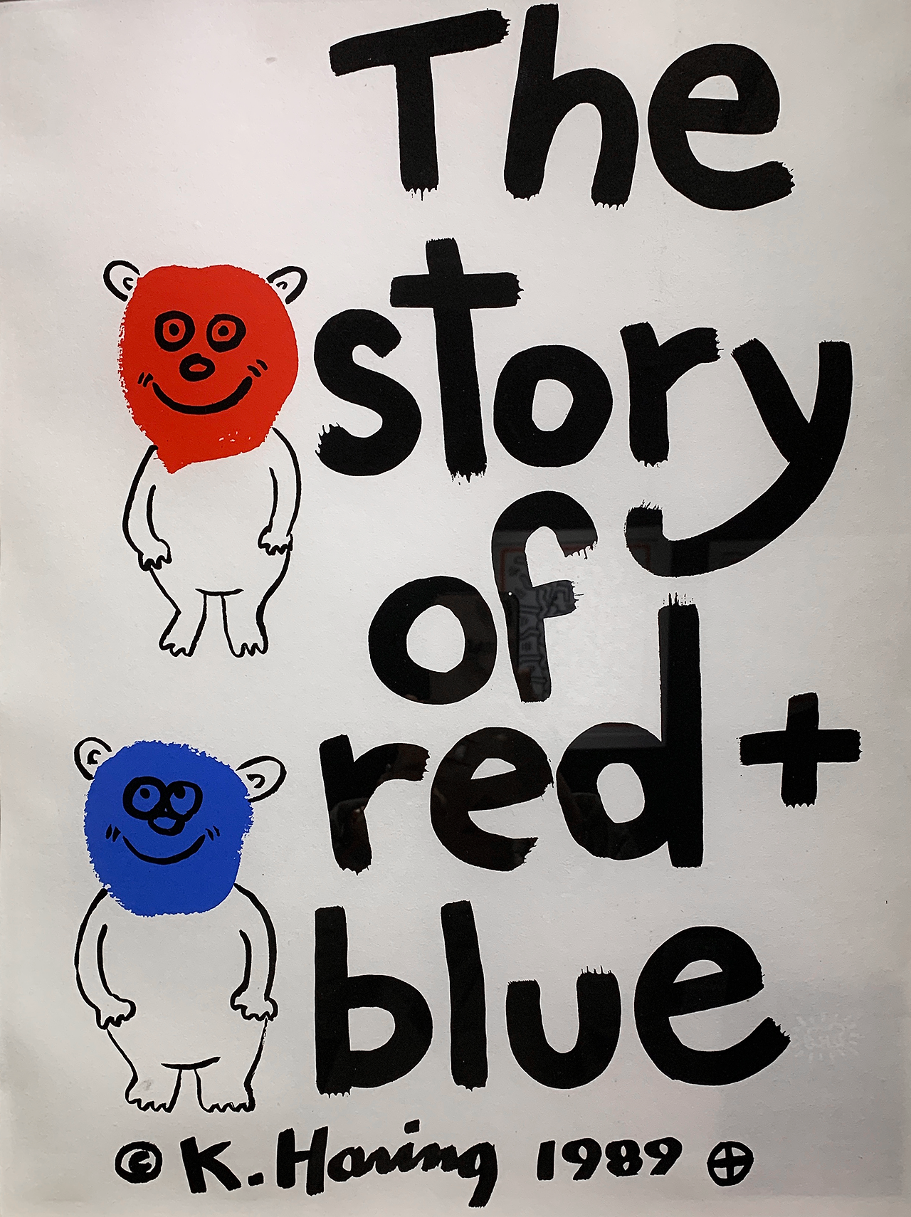 <빨강과 파랑의 이야기>는 특별히 해링이 어린이들을 위해 만든 21개의 석판화 시리즈입니다. 해링은 이 작품을 만들면서 어린이들이 자신만의 상상력을 발휘해서 각기 다른 이야기들을 만들어 내길 원했다고 합니다. 각 그림은 해링이 배열한 순서대로 배치되어 있고, 마지막 장에는 빨강과 파랑이 보라색의 계란 모양 형태가 되는 것으로 끝납니다. 해링은 시리즈가 합쳐져서 하나의 이야기가 만들어지는 것을 의도했다고 하는데요. 키스 해링의 말처럼 어른들이 잊고 있는 아이들의 다양한 이야기가 궁금해지는 작품이었습니다. 이 프린트들은 이야기 경연대회에도 사용됐으며, 미국의 많은 학교, 어린이 미술관에서는 교재로 채택해서 교육프로그램에 이용하고 있다고 합니다.