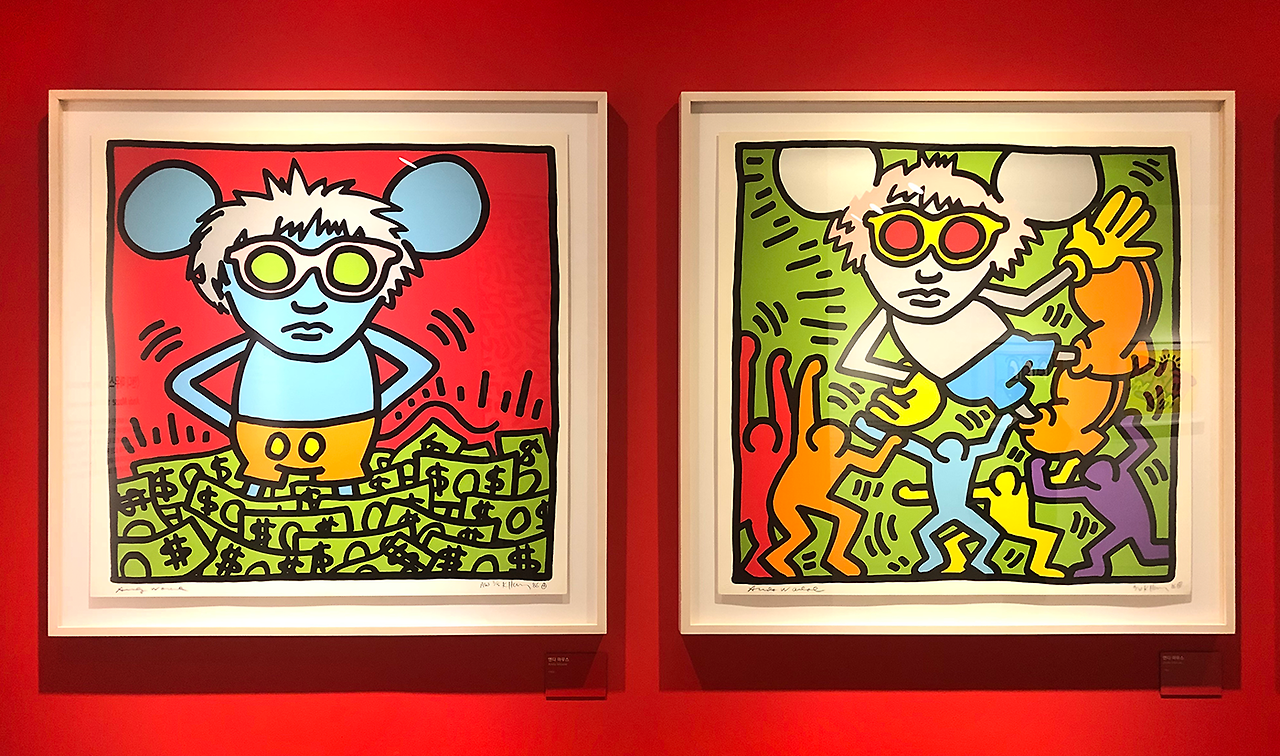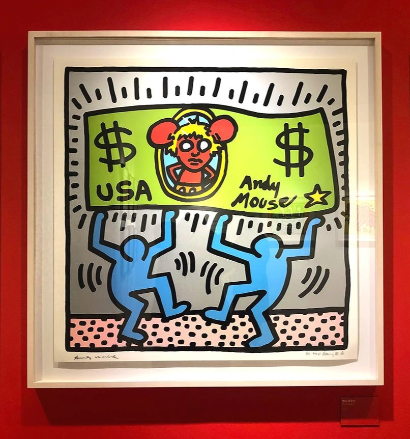 앤디 마우스는 해링이 어린 시절부터 가장 좋아하던 캐릭터였던 디즈니의 미키 마우스와 친구이자 멘토였고 팝아트를 선도했던 작가, 앤디 워홀을 합쳐 탄생시킨 캐릭터입니다. 모든 작업에는 키스 해링과 워홀 두 사람의 서명이 다 들어가 있고, 이 둘의 서명은 다른 세대를 살았던 두 사람 사이의 다리와도 같은 역할을 했습니다. 마치 만화 캐릭터처럼 그려진 앤디 마우스와 그 이미지 위에 새겨진 달러 표시는 자본주의 사회의 아이러니를 묘사한다고 볼 수 있습니다.