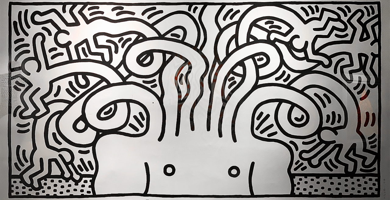 이 작품은 해링의 판화 중 가장 사이즈가 큰 작품입니다. 그리스 신화에 나오는 머리카락이 뱀으로 된 괴물, 메두사가 그려져 있는데요. 신화와는 달리 해링이 그려낸 메두사는 7개의 목을 가지고 있고, 목이 굉장히 구불구불하며 각 목의 끝에는 사람의 몸이 달려있습니다.