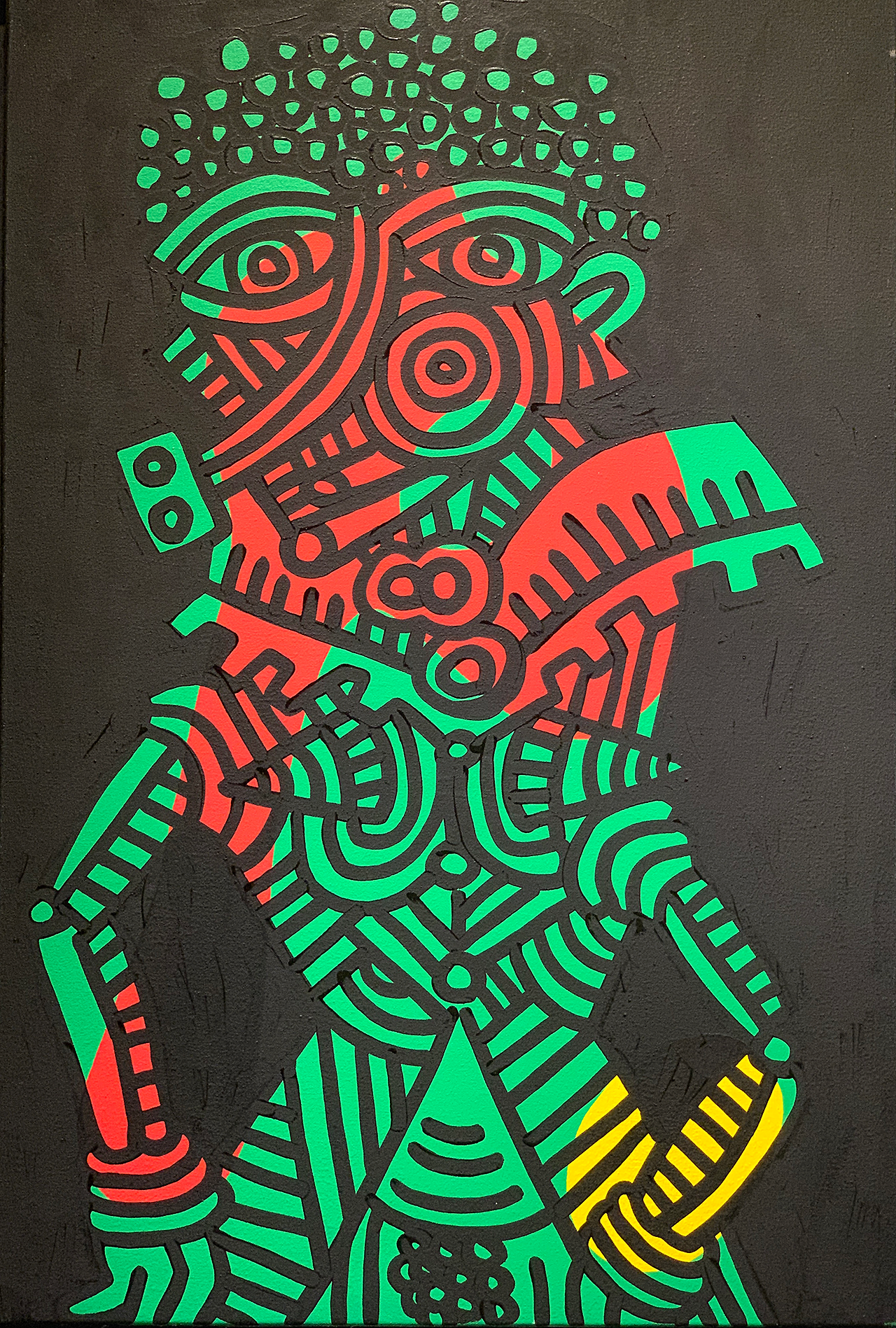 무수한 인물, 동물, 태양 및 가면으로 가득 찬 피라미드, 바디 페인팅과 토템. 해링 자신의 말에 따르면 그의 모든 작품은 토속 미술과 전문적인 예술 사이에, 그리고 창작과 차용 사이에 존대한다고 합니다. 그의 작품은 아즈텍, 에스키모, 아프리카 및 아프리카계 미국인의 예술이나 신화 속 고대 기호와 같은 비서구적인 예술 뒤에 숨겨진 신비한 힘을 보여줍니다.