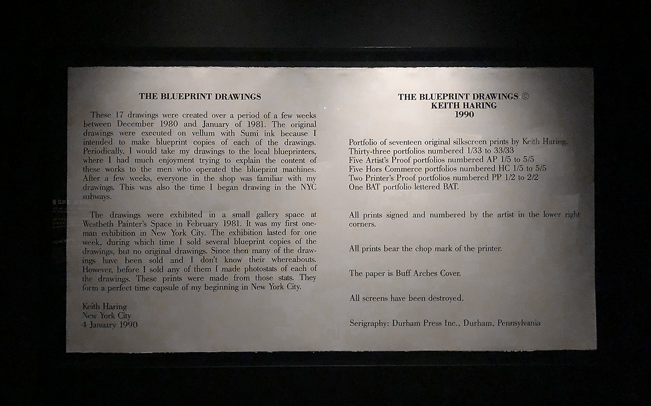 그 전시 이후로 나는 드로잉을 꾸준히 팔았다. 그렇지만 그 작품들이 어디로 팔렸는지는 모른다. 다행히도 나는 작품들을 팔기 전에 모든 작품들을 복사해놓았다. 지금 이 프린트들은 그 복사본으로 만들어진 것이다. 이 작품들을 보고 있노라면 마치 타임머신을 타고 내가 처음으로 뉴욕 생활을 하던 그 아름다웠던 시기로 돌아가는 듯하다." - 키스 해링, 뉴욕시티 1990년 1월 4일