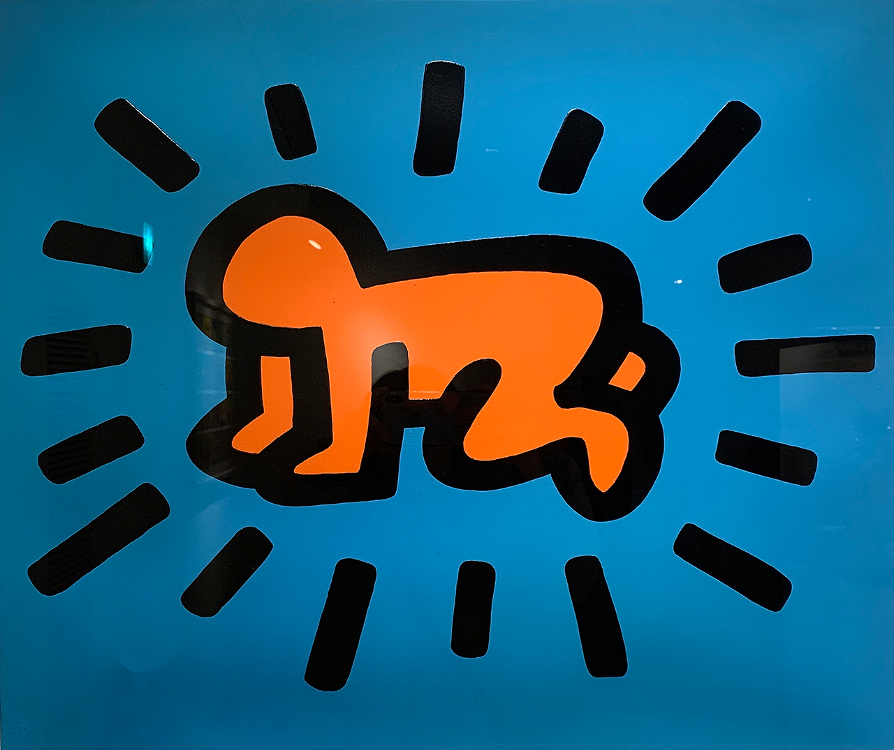 5개의 석판화 시리즈는 키스 해링이 사망한 해인 1990년에 제작되었습니다. 이 소재들은 해링의 대표 도상이라고 할 수 있는데요. 이 중 기어 다니는 아기는 그가 그린 인물 소재들 중에서 가장 빈번하게 보이는 이미지입니다. 그의 일기장에서 언급했듯이 <빛나는 아기>는 어린 시절의 천진함, 순수함, 선함과 모든 가능성을 상징하며, 아기 캐릭터 그 자체가 바로 해링 자신의 반영이라고 할 수 있습니다.