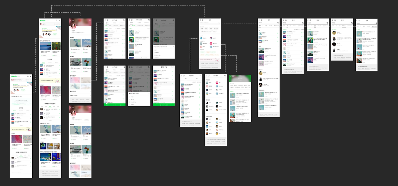 타사 리서치와 벤치마킹 작업은 카카오멜론의 서비스 볼륨에 적합한 메뉴 구조 및 탭 형태, 접근빈도가 가장 높은 검색페이지에 대한 구조설계, 멜론보다는 가벼운 서비스인 만큼 사용성을 올려줄 수 있는 My 및 상세페이지에 대한 구조등에 대한 아젠더를 가지고 아이데이션 작업을 진행하였습니다.
