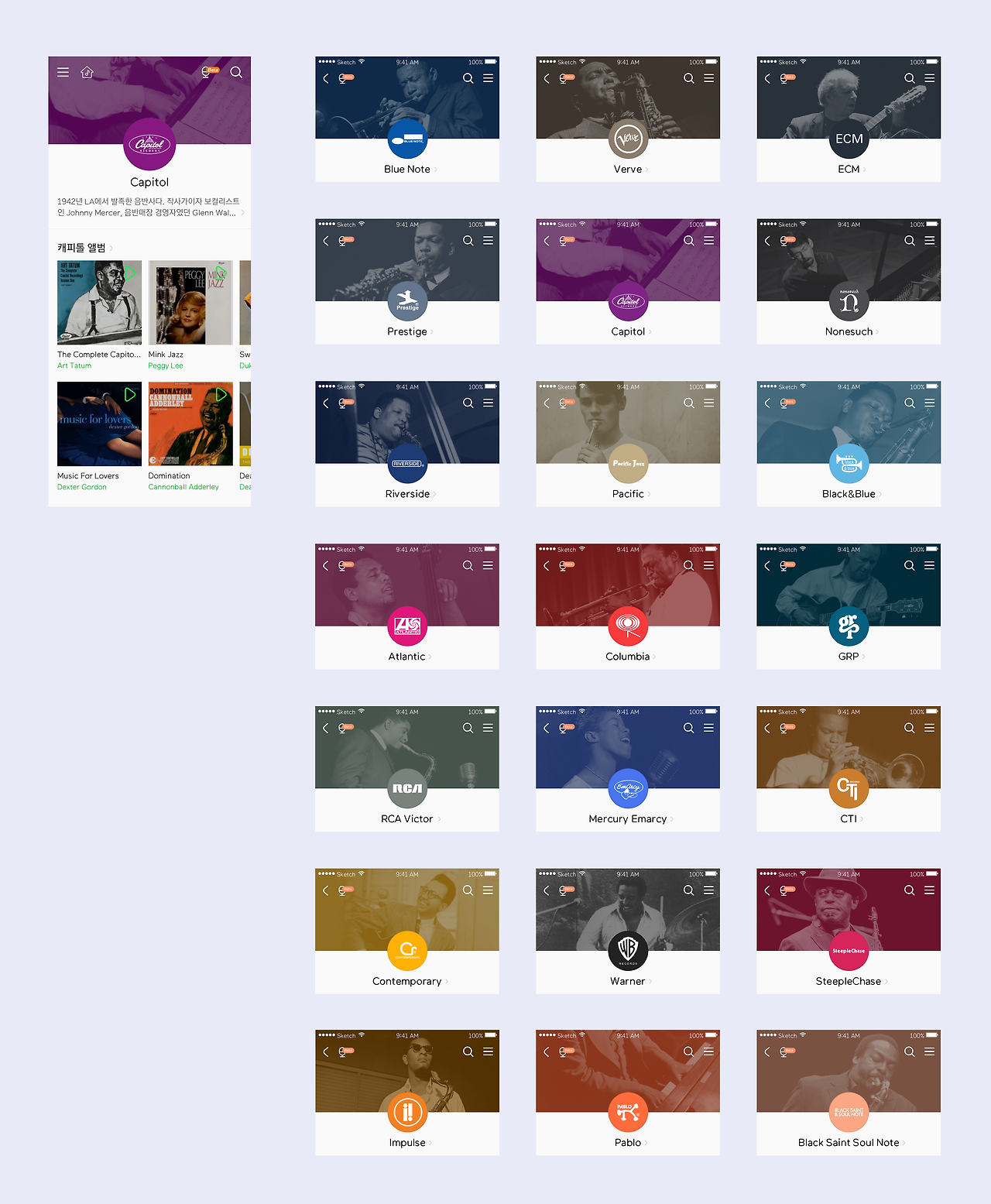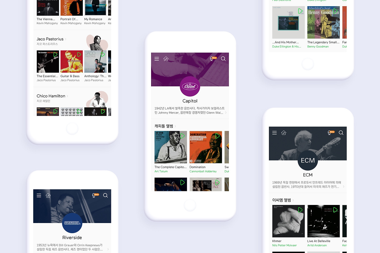 현재 29개의 장르 중에 '재즈'에 들어가게 되면 다른 장르 홈과는 다르게 '재즈 레이블'이라는 부가적인 메뉴를 확인할 수 있습니다. 총 20개의 재즈 레이블이 있고 해당 페이지에 들어가게 되면 레이블별로 모아놓은 다양한 음악 콘텐츠들을 접할 수 있습니다. 레이블의 대표 이미지를 정할 때는 눈에 확 띌 수 있게 각각의 배경색을 지정하여 깔고 white 컬러의 로고를 그 위에 얹었는데요. 하얀 배경 위에 로고만 넣는 것보다 확실히 더 주목성 있게 보여줄 수 있고 해당 레이블만의 느낌을 줄 수 있었습니다. 이때 BG로 들어가는 색상은 브랜드 컬러를 사용하거나 공식 채널/웹사이트/음반 디자인에서 사용한 컬러를 기반으로 추출하여 작업했습니다.