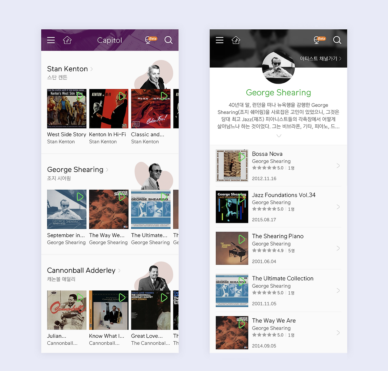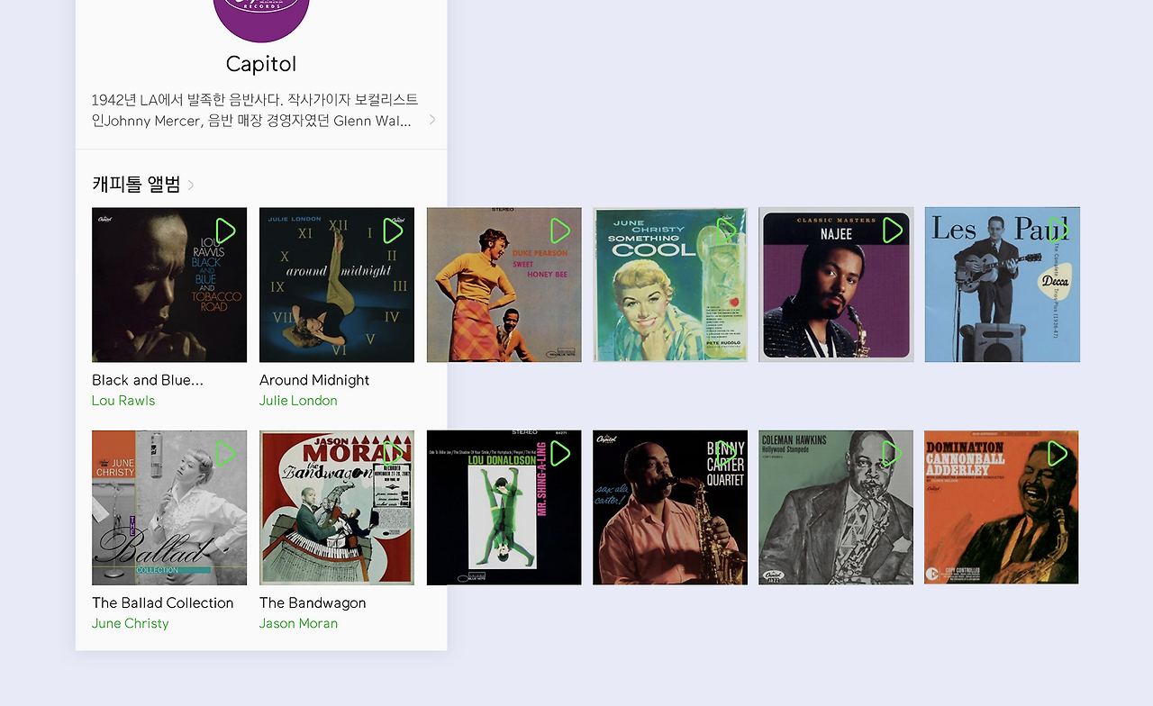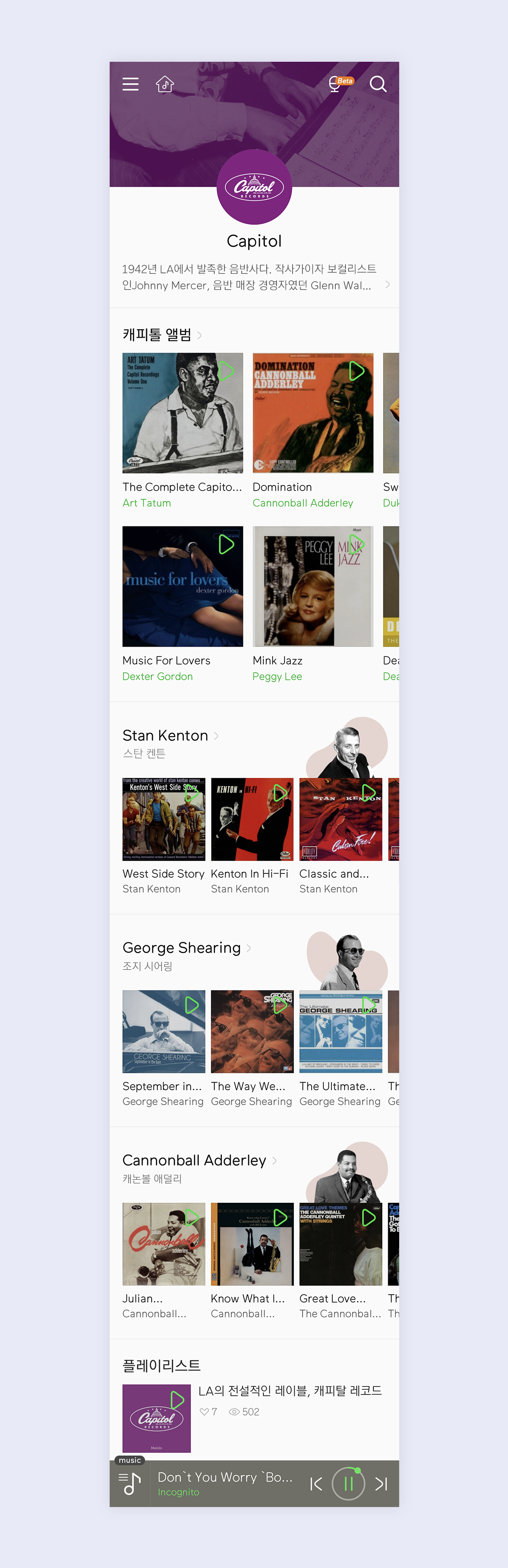 다음은 해당 레이블의 주요 아티스트 앨범 DP영역입니다. 앨범은 최대 18개까지 나오며 더보기 화살표를 누르면 아티스트에 대한 정보와 더 많은 앨범을 확인할 수 있습니다. 리스트 우측 상단에는 아티스트의 실사 이미지가 DP 되는데요, 이미지 뒤에 자유분방한 곡선 느낌의 패턴을 깔아서 재즈 느낌을 살려보았습니다.