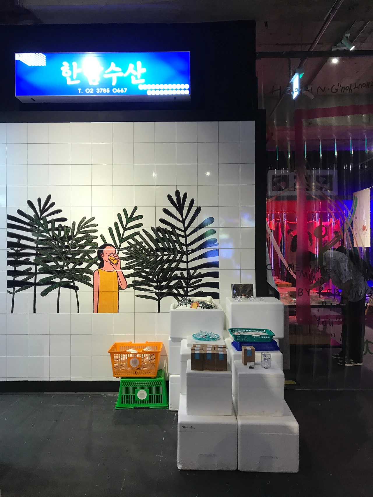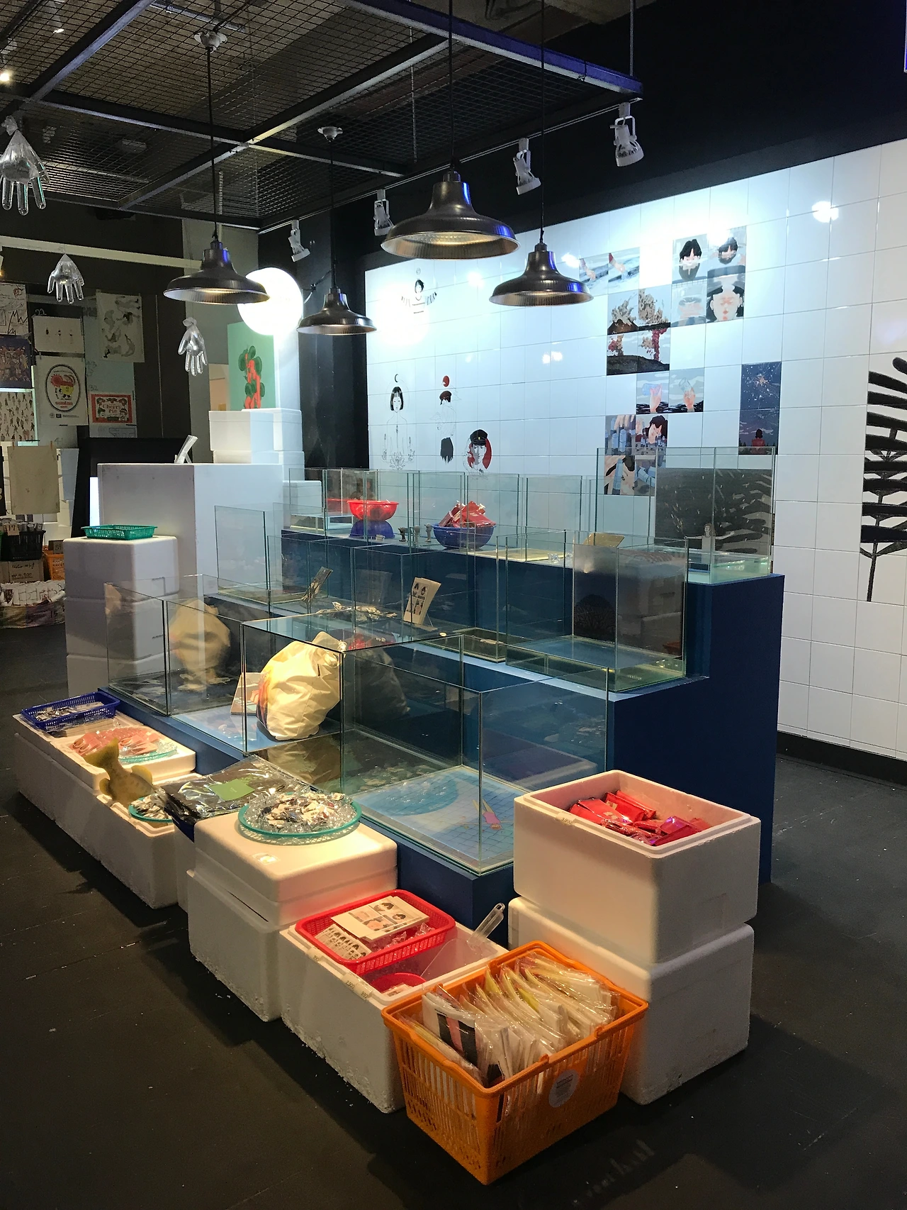 여기부터는 한남수산입니다. 갑자기 수산시장이 있는가 싶지만.. 자세히 보면 역시 작품들과 콜라보된 소품들이 즐비하고 마치 생선처럼 진열해 놓았네여 , 파리들 붙지 말라고 비닐장갑에 물도 넣어두었네요. 생선담아왔을 스티로폼박스까지 리얼하게 재연해 두었답니다.