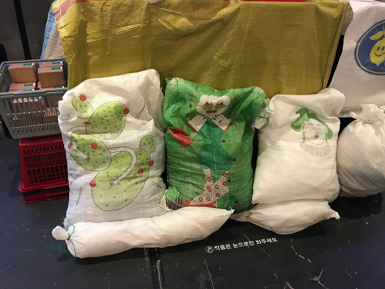 쌀포대, 비닐봉투같은 곳에 캐무작가의 일러스트가 인쇄되어 있어요. 그냥 일반 노란색 하얀색 시장용 비닐봉지가 가지고 싶다고 느껴보기는 첨인듯합니다. 명품만 아티스트작품과 콜라보 하는게 아니네요~^^