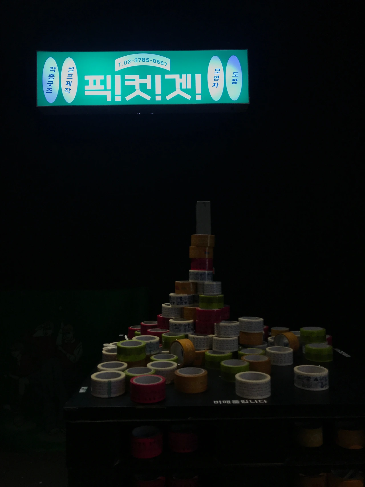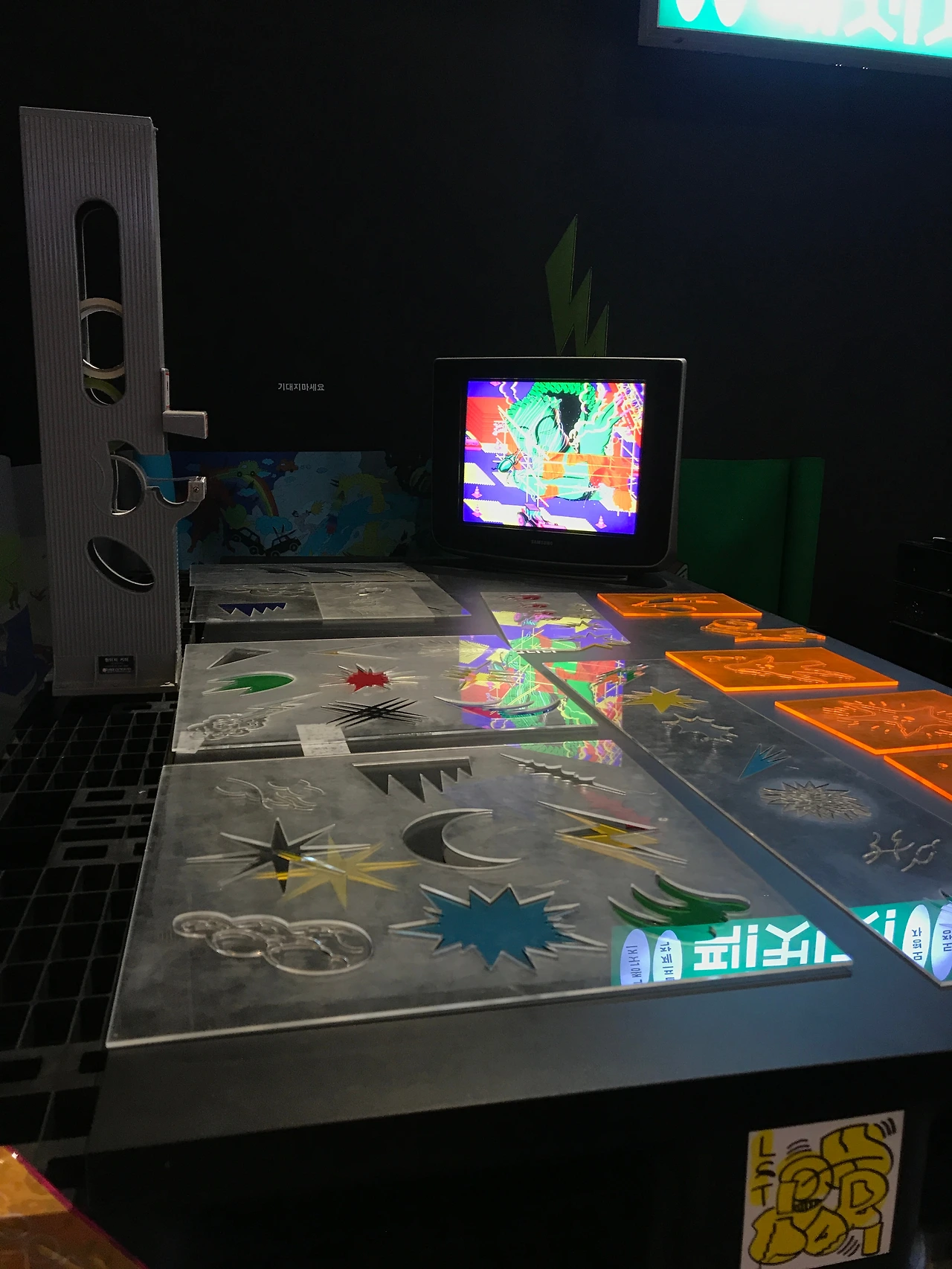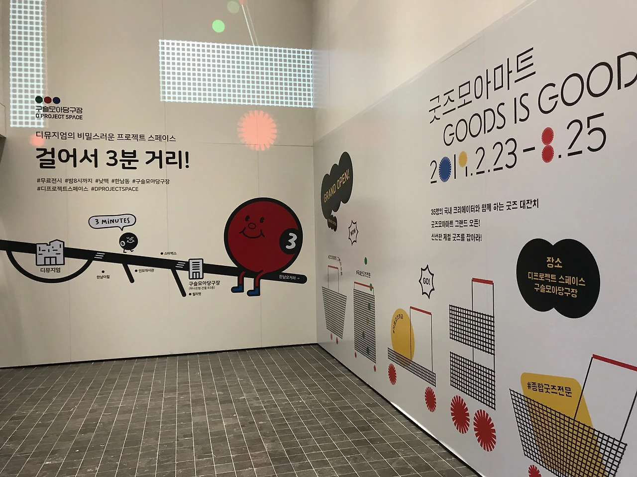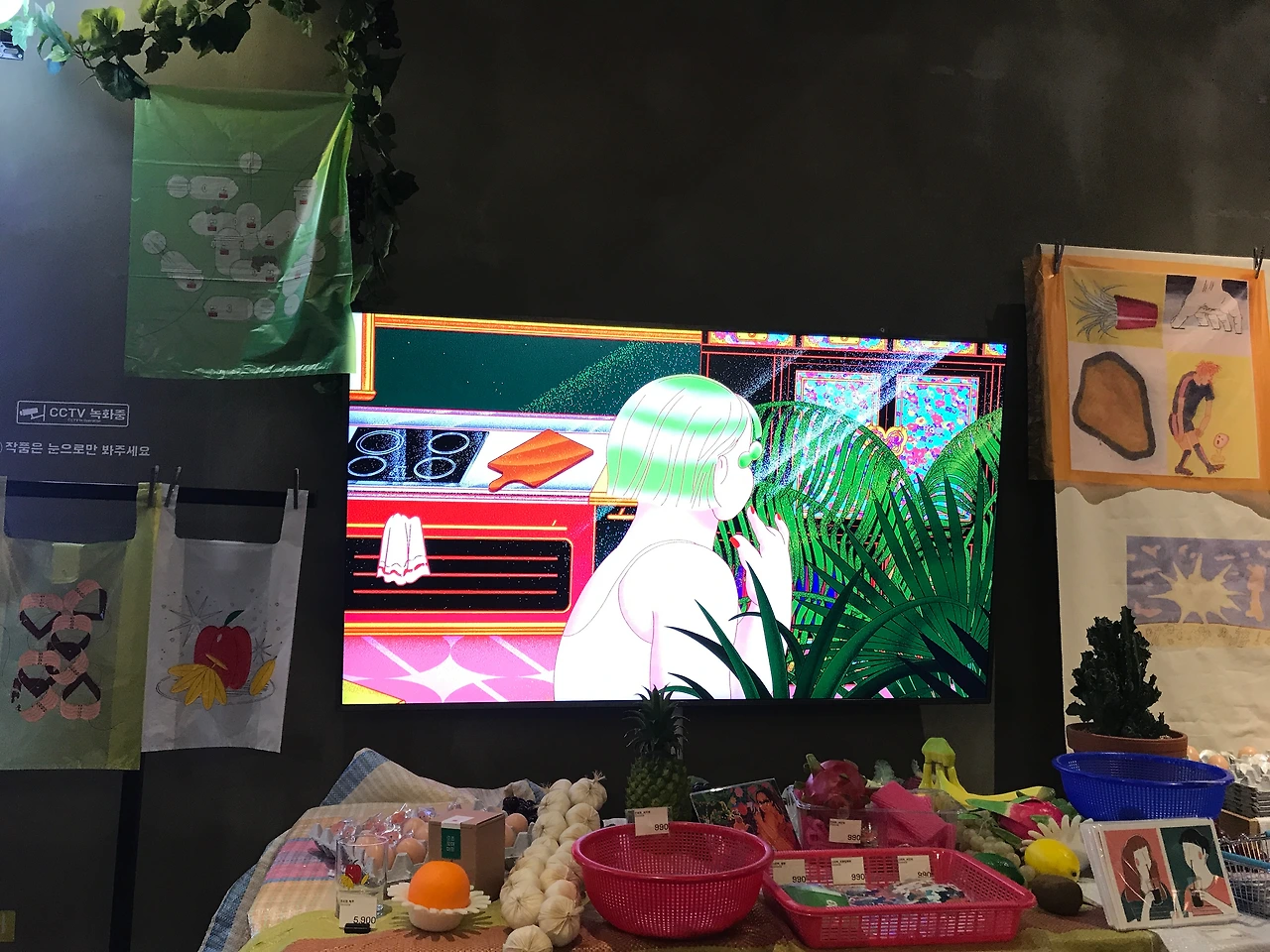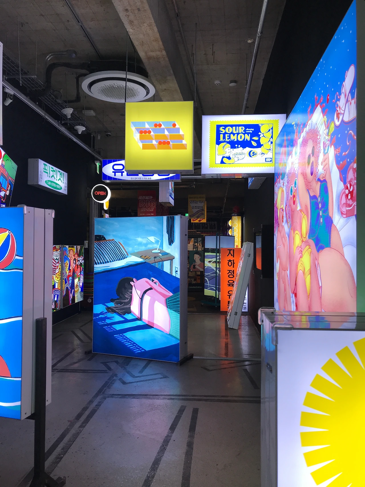 "유리컵, 엽서, 찍찍이지갑, 돗자리, 핀뱃지, 장난감퍼즐, 모형자,도장등등.. 각종 굿즈 취급" 이라고 쓰여진 간판들 부터 다양한 sign들이 등장합니다. 그사이사이에는 작가들의 일러스트 작품과 영상작업물들을 설치해두어 복잡복잡한 도심의 뒷골목 같은 느낌을 연출합니다. 라이트박스 사이사이 골목을 지나듯 움직이며 마트로 들어가다보면 작품들 하나하나 구경하는 재미가 있습니다.