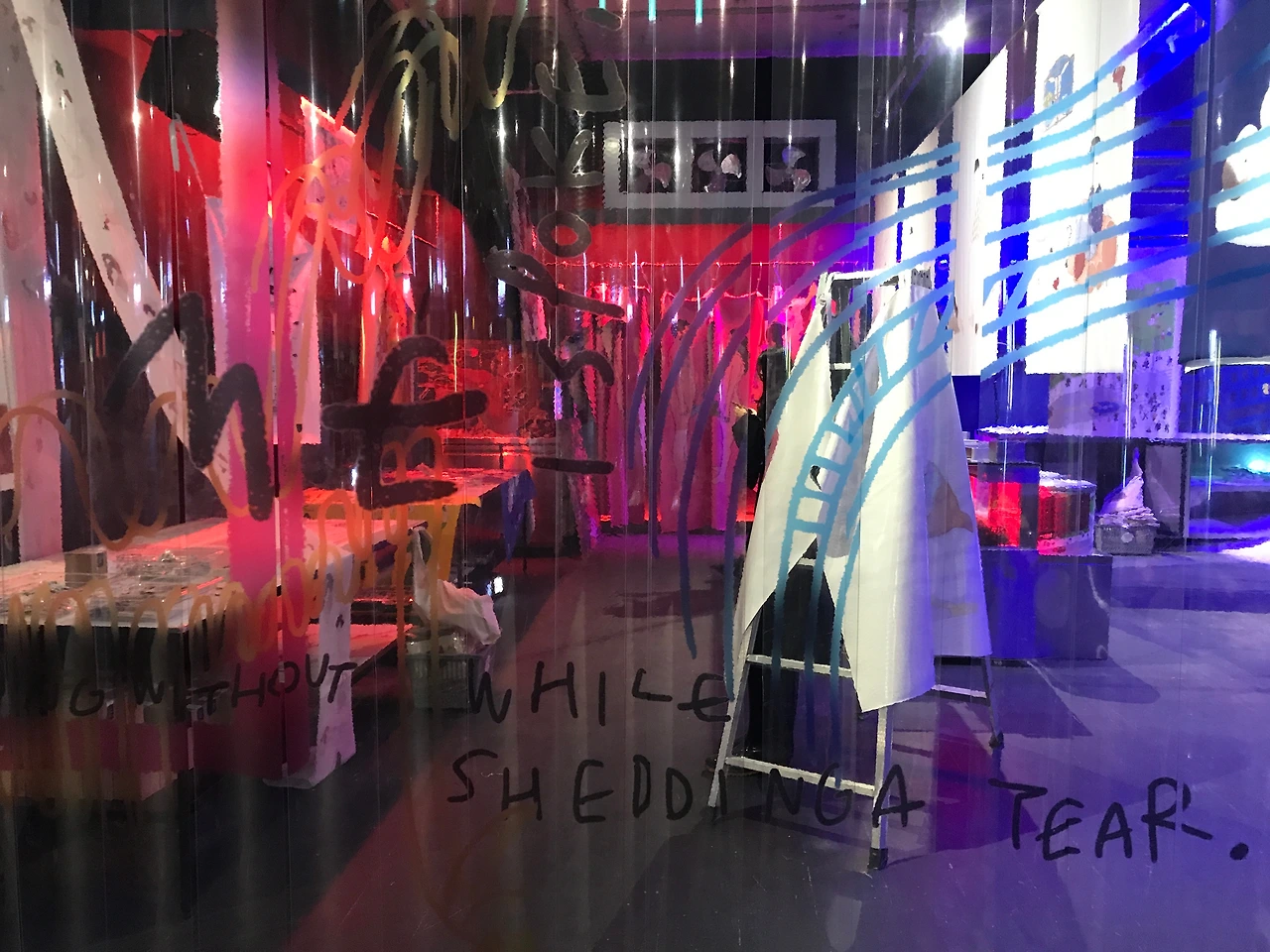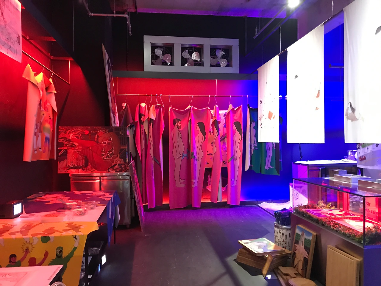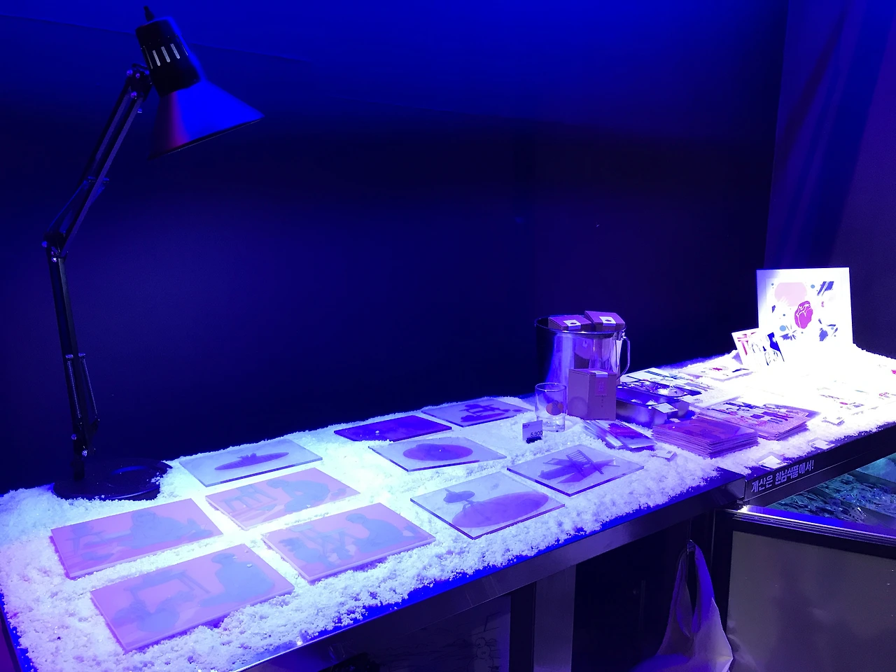 붉은 조명의 정육점입니다. 여기는 정육점이다 보니 몸에 대한 키워드인듯 합니다. 19금 스러운 일러스트들로 조금은 B급예술들의 집합소 같은 느낌을 줍니다. 바로 옆의 푸른색 조명의 공간은 냉동공간입니다. 얼음 사이사이 작품들이 진열되어있어요. 굿즈들을 급속 냉동해준다는 재밌는 컨셉입니다.