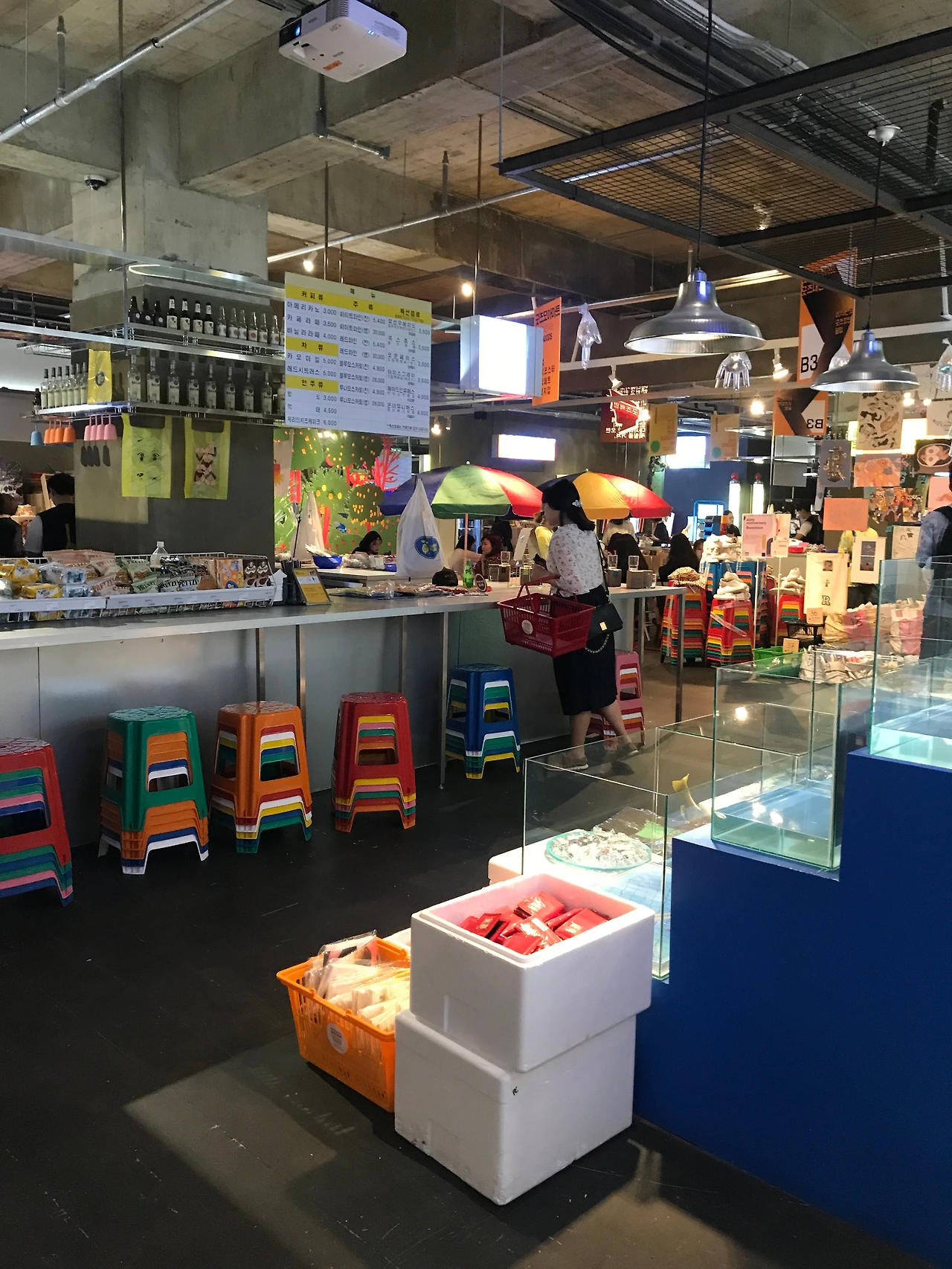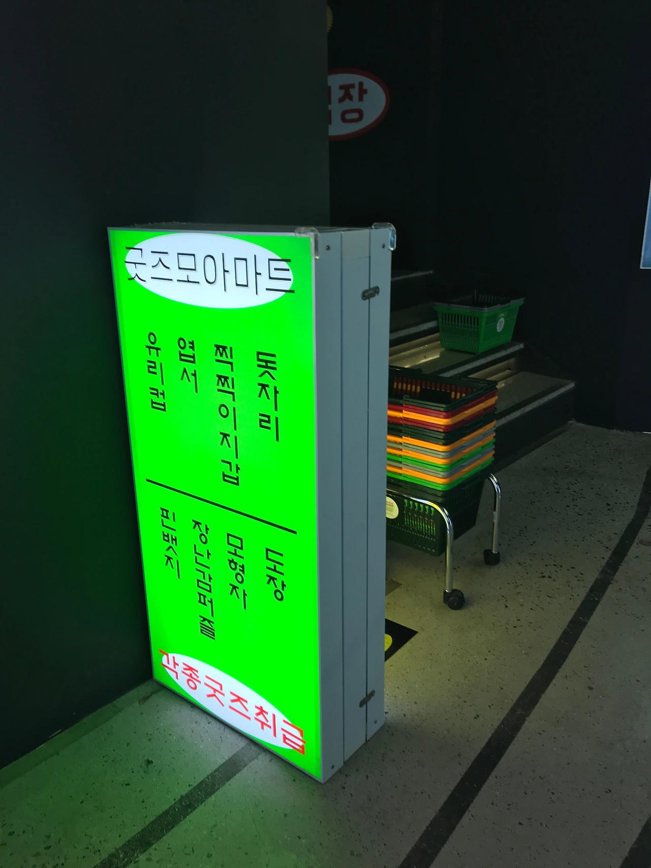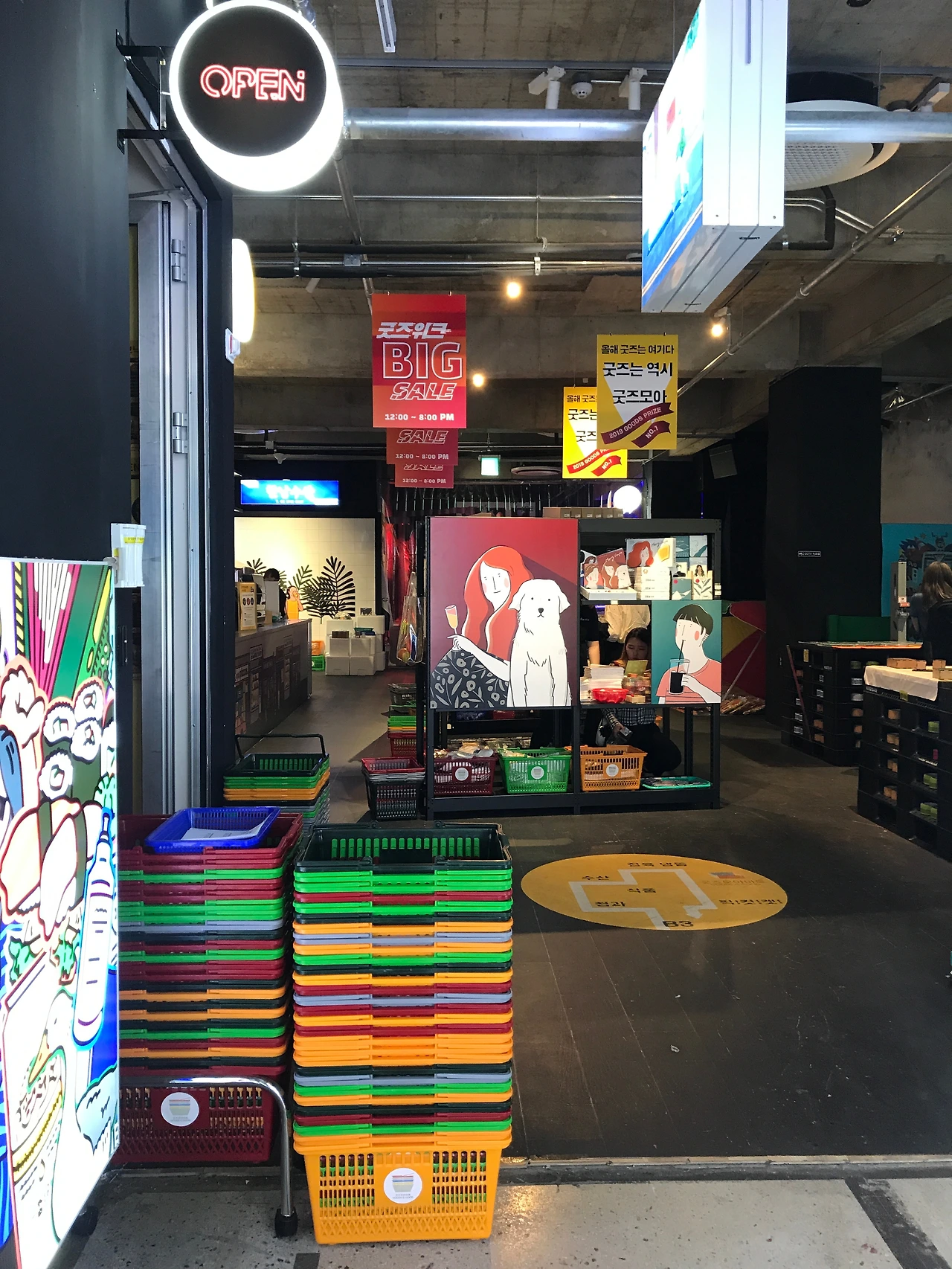 마트 시작공간에는 플라스틱 장바구니가 준비되어있어서, 장바구니 하나씩 들고 가벼운 마음으로 전시를 보면 됩니다.