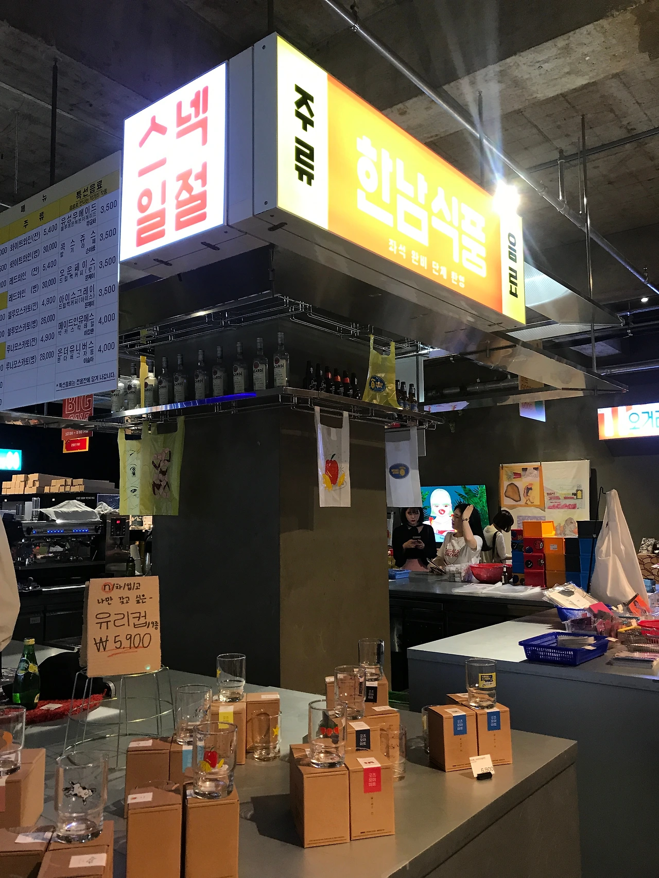 가운데쪽에는 한남식품점입니다. 모든 굿즈 상품 계산과 식품류 주문이 가능한 곳인데요.. 겹쳐진 플라스틱 의자들과 메뉴판, 식품점 간판디자인, 문구등 일관되게 정감있네요.