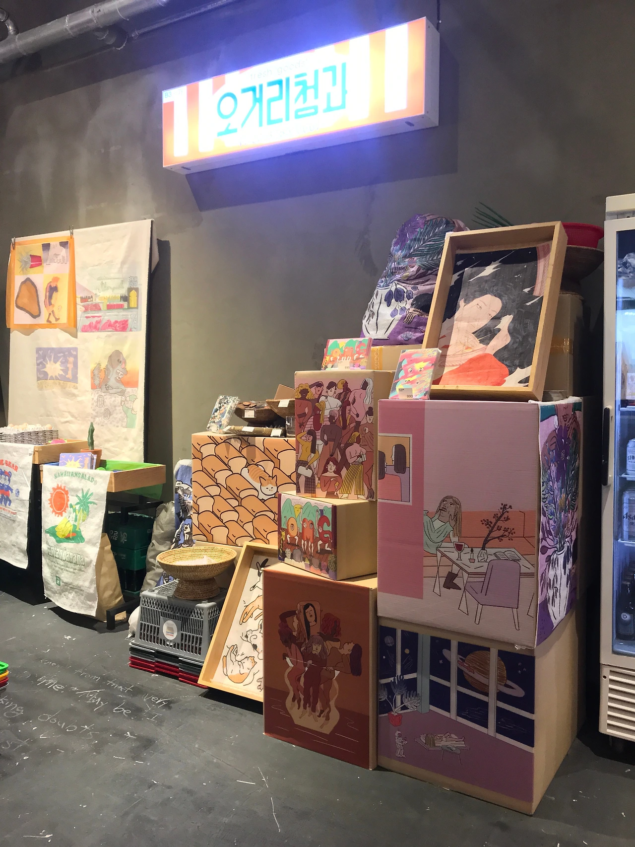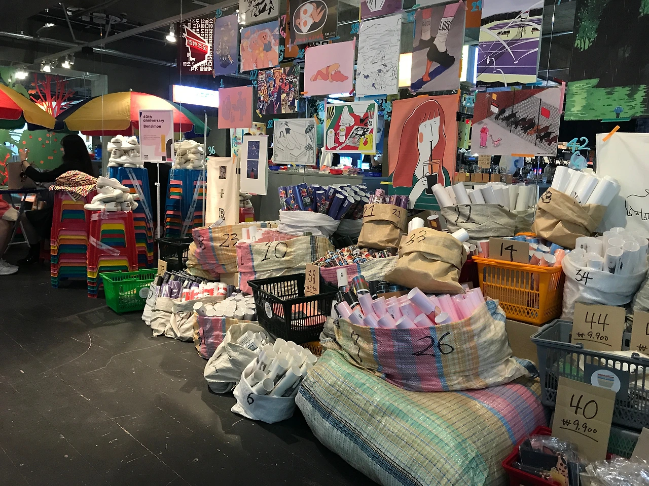 어느 상점 소속인지는 모르겠지만 구석 모퉁이에는 일러스트 포스터나 패브릭 포스터등을 돌돌 말아서 꽂아두고 골판지에 매직으로 쓱쓱 적어둔 가격표가 꽂혀있습니다. 선뜻 골라지지는 않았기에 그냥 지나쳤지만 전시를 보는동안 발견할 수 있었던 작가들의 일러스트 작품들을 한번에 볼 수 있는 공간이었습니다.