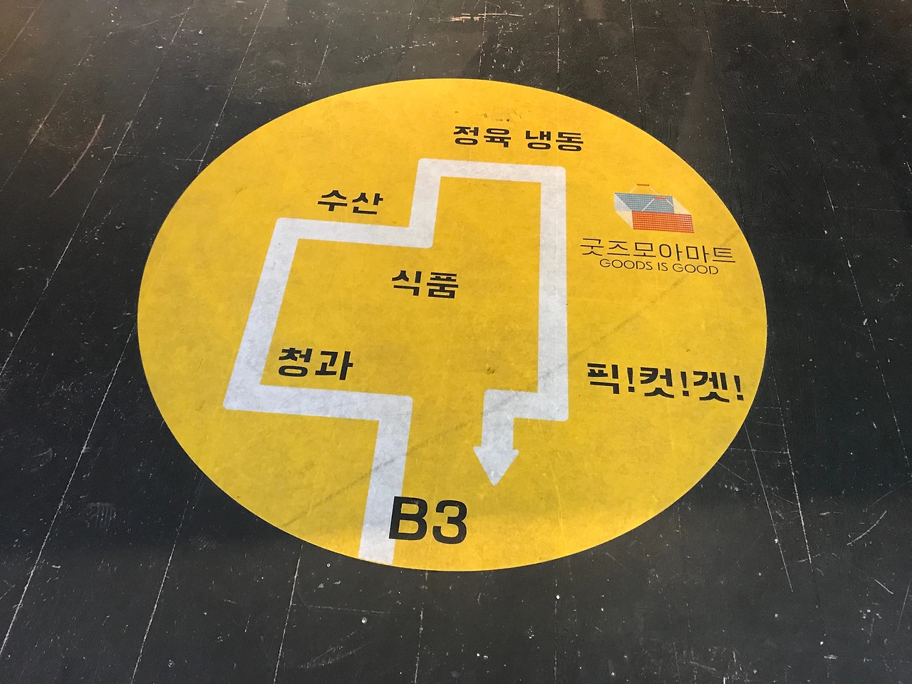 전시공간이 넓진 않지만 북적북적 다양하다보니 바닥에 붙어있는 동선에 대한 가이드를 발견! 전시를 한눈에 쏙~파악할수 있어서 반가운 생각이 듭니다. 동선대로 따라 가다 보면 카테고리별 - 청과물시장 , 수산시장, 식품코너, 정육냉동 컨셉의 설치공간을 구경하고 마지막에는 픽!컷!겟! 체험공간까지~ 쉽게 관람할 수 있습니다.
