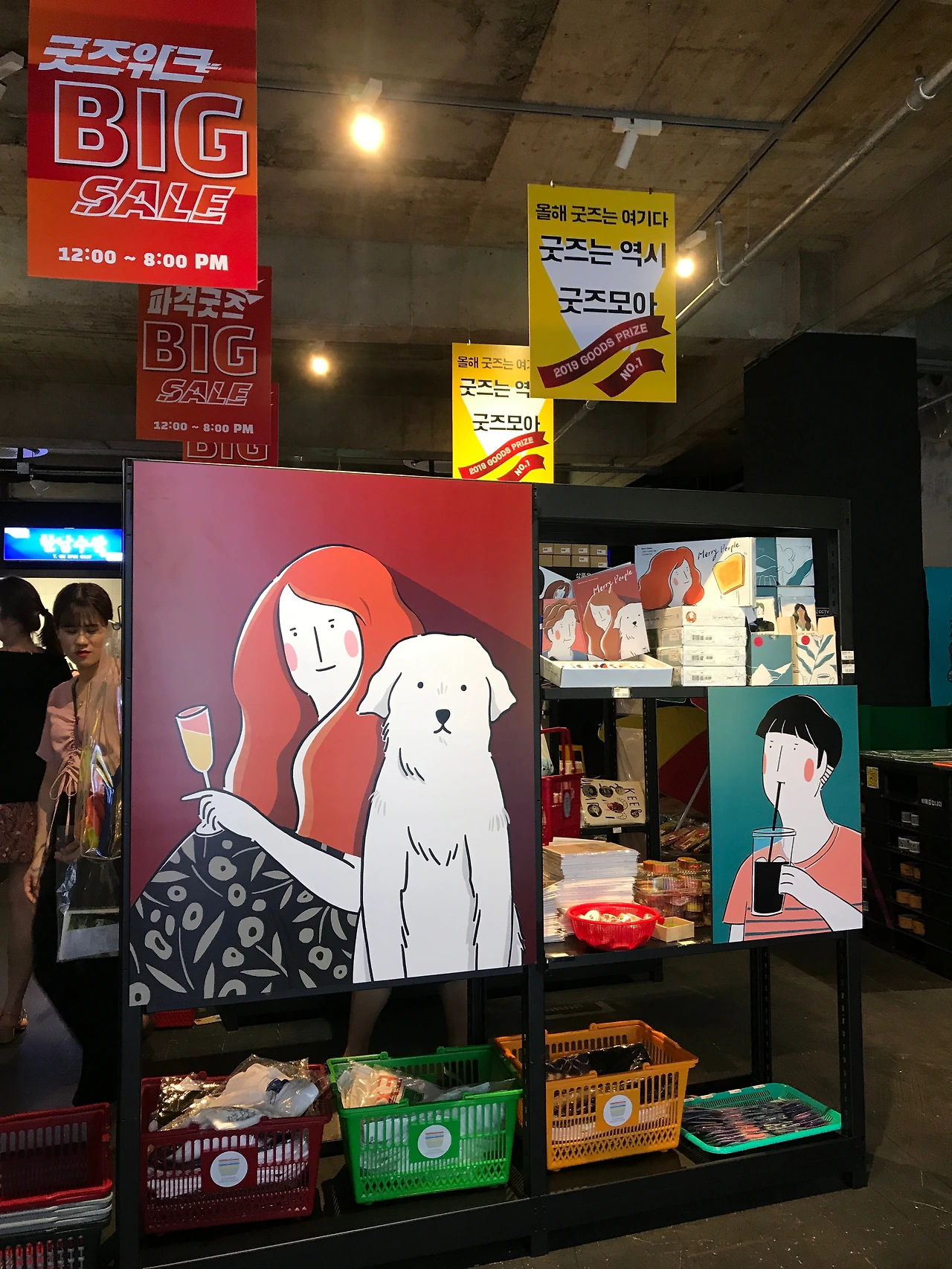 어릴 때부터 문방구를 좋아했고 평소에도 종로 완구거리나 소품샵 구경을 좋아해서 그런지 마트 컨셉의 굿즈 전시는 아주 친숙한 느낌으로 관람을 할 수 있었습니다! 옛날 초등학교 앞의 문방구에 온듯한 느낌으로 신나서 하나하나 구경하다 보니 어느새 장바구니에 저도 모르게 굿즈들이 수북.. 재밌는 컨셉, 굿즈들에 그려져있는 그림들을 보니 작품이 더 기억에 남는 느낌이 들었어요.