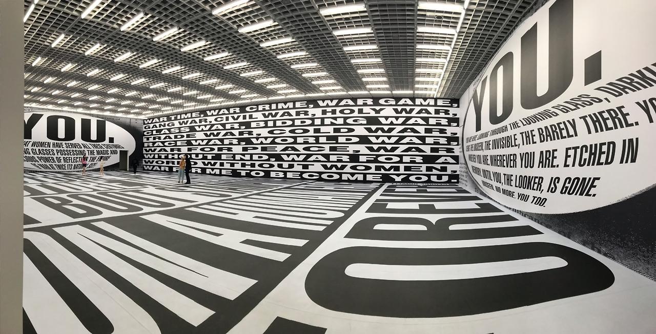 크루거가 이번 전시를 위해 제안한 두 번째 한글 신작은 '제발웃어제발울어'입니다. 이 텍스트는 자체가 독립된 조형요소로써 자율적으로 기능하면서 압도적인 시각적 효과를 만들어 냅니다. 이 작품으로 텍스트를 다루는 크루거의 방식이 과거 의미 중심에서 조형 중심으로 발전해가고 있는 양상을 살필 수 있습니다.