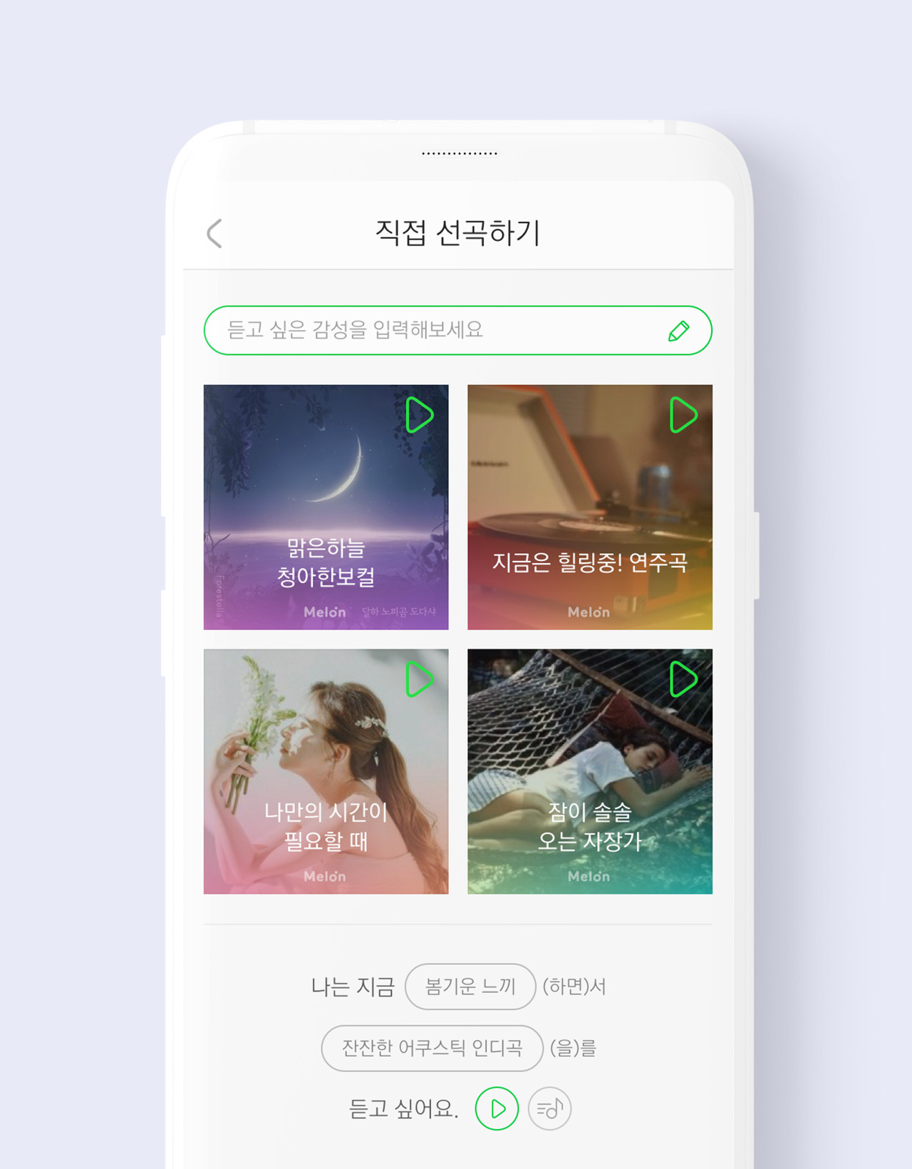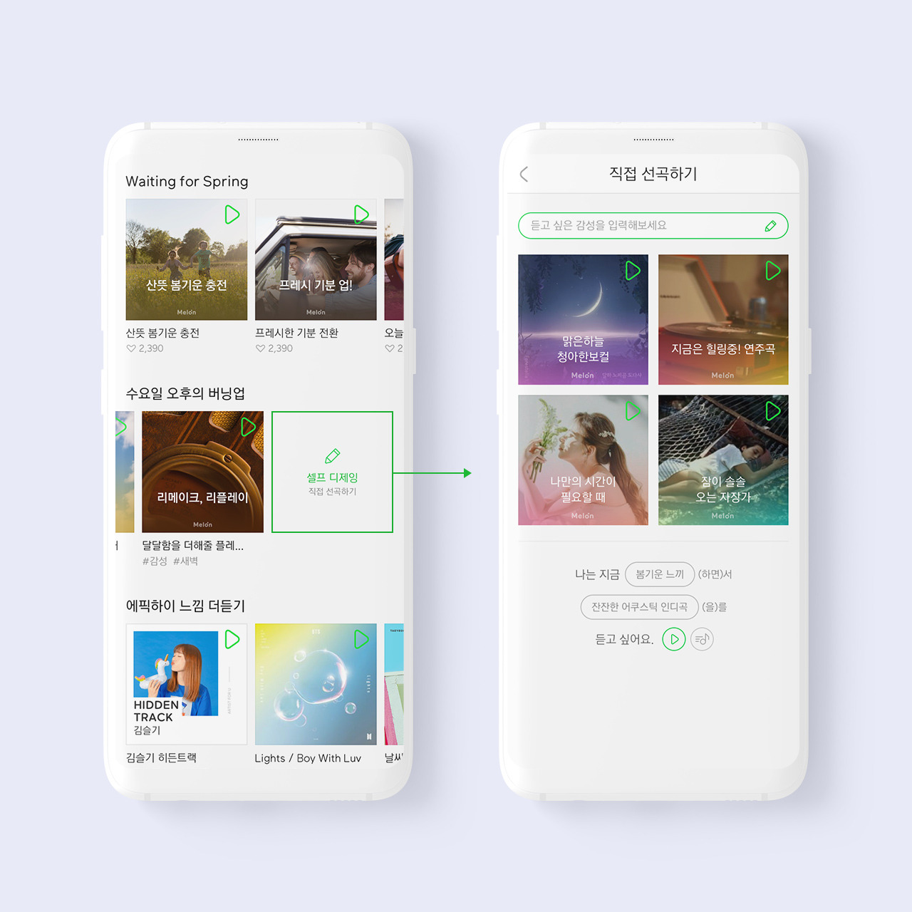 추천 컨텐츠의 감상 경험과 개인화 맞춤 추천시스템의 설정 경험을 완전히 독립적으로 분리하여 메인에서는 물흐르듯 자연스럽게 추천음악에 집중할 수 있게되었습니다.