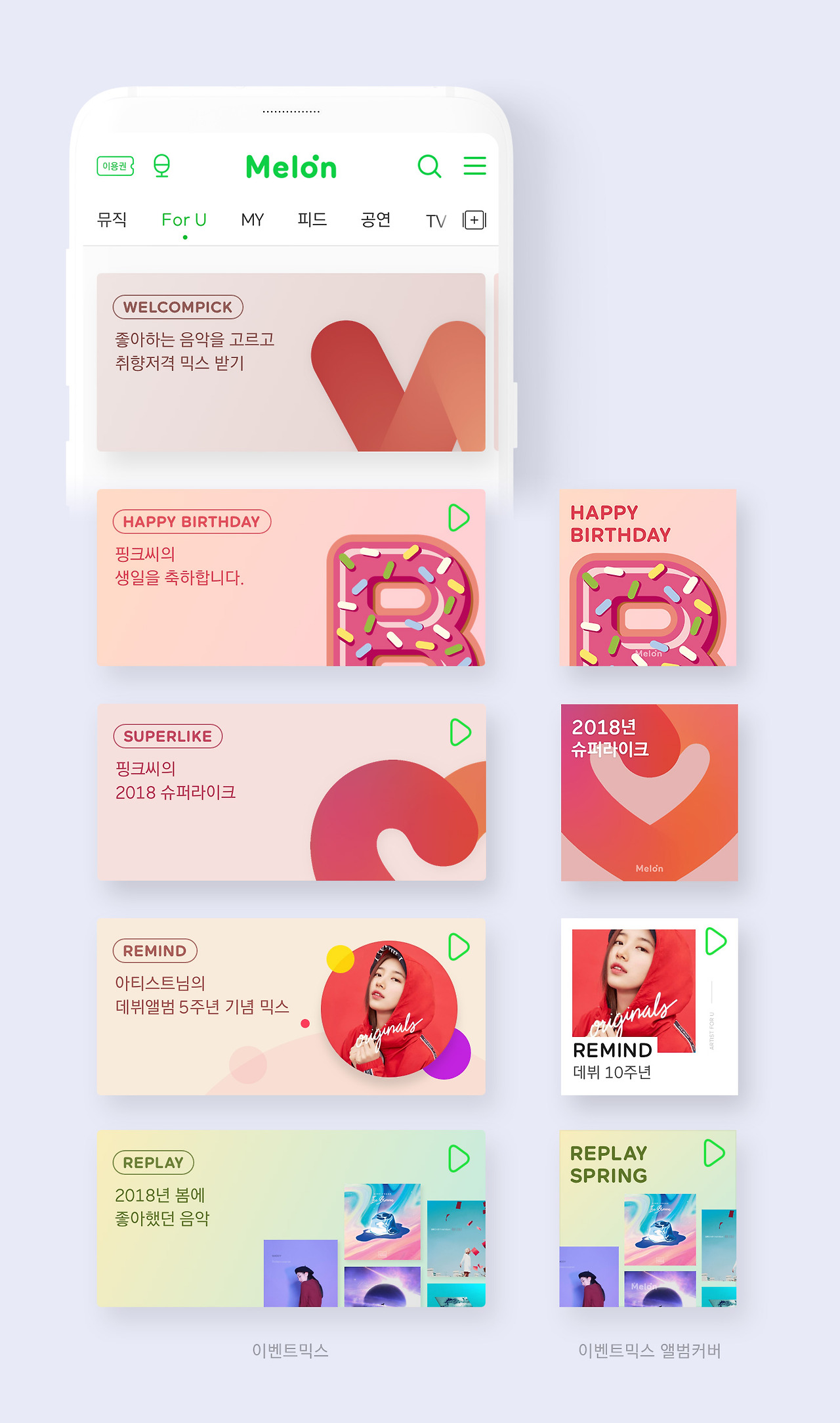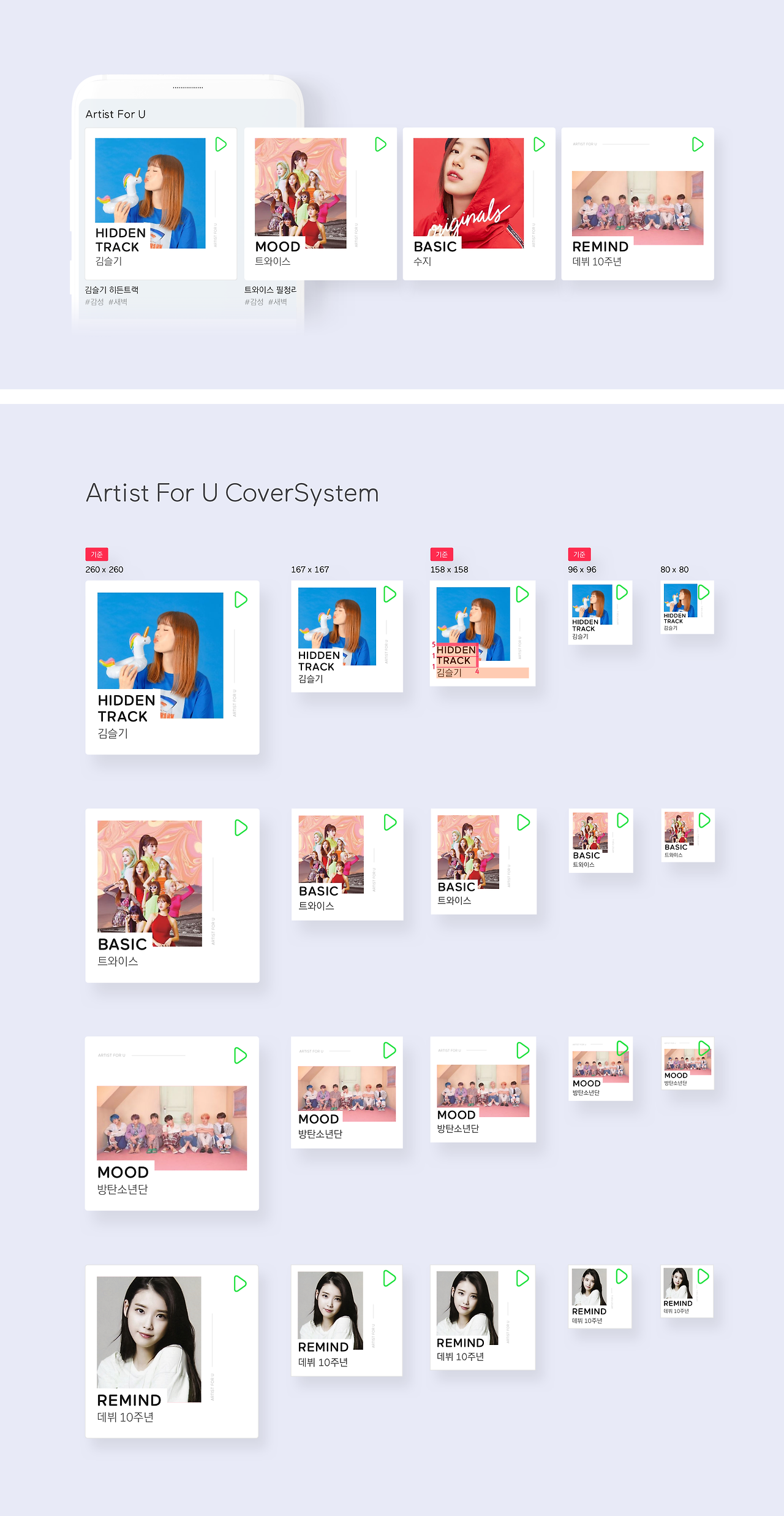 For U 뿐만아니라 멜론서비스내의 모든 화면의 앨범커버 사이즈를 대응하기위해 기준사이를 정하고 사이즈별 대응 범위를 규정하여 어떠한 화면에서도 일관된 모양으로 아티스트 포유커버의 아이덴티티를 이어갈 수 있게 디자인 되었습니다.