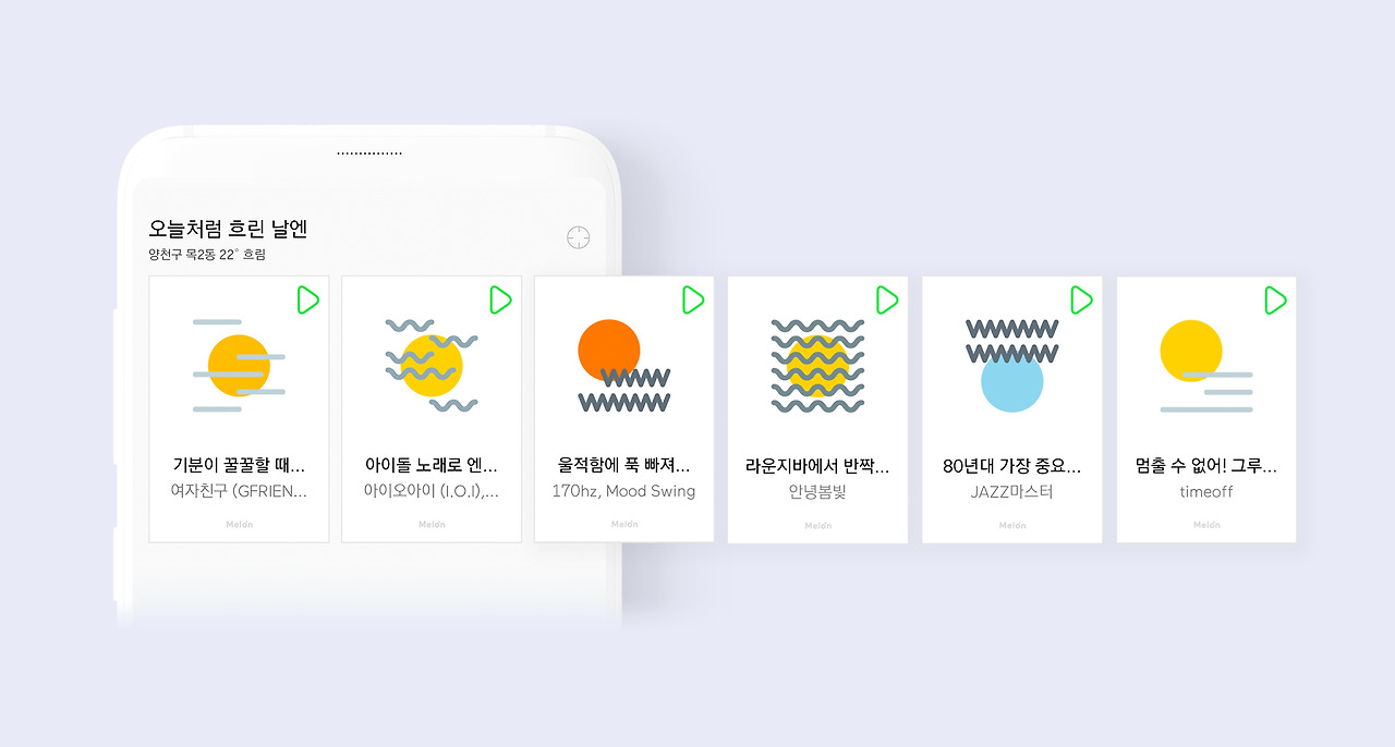 그리고 기존 날씨기반 추천 컨텐츠는 기본 날씨정보만 제공하고 선택하면 바로 곡리스트로 진입하는 플로우였는데요 이 부분도 추천시스템을 통해 오늘의 날씨를 기준으로 추천음악들을 포유메인에서 바로 노출하여 접근성을 높이고 음악감상을 좀더 쉽고 편안하게 하였습니다.