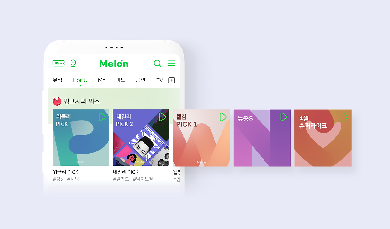 이번에 개편된 For U 에서는 조금더 고도화된 개인화 추천 시스템을 통해, 나의 감상 이력을 기반으로한 데일리, 위클리, 먼슬리 등의 개인화믹스를 받아볼 수 있습니다. 그리고 첫 멜론 유저들을 위한 웰컴픽과 신곡 기반 추천의 뉴쏭S, 4계절 나만의 감성 추천 계절별 믹스, 매년 핫한 잇곡들을 추천 슈퍼라이크 등 아주아주 특별한 이벤트 믹스를 감상할 수 있습니다.