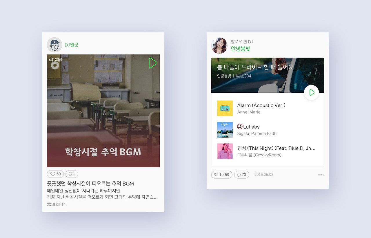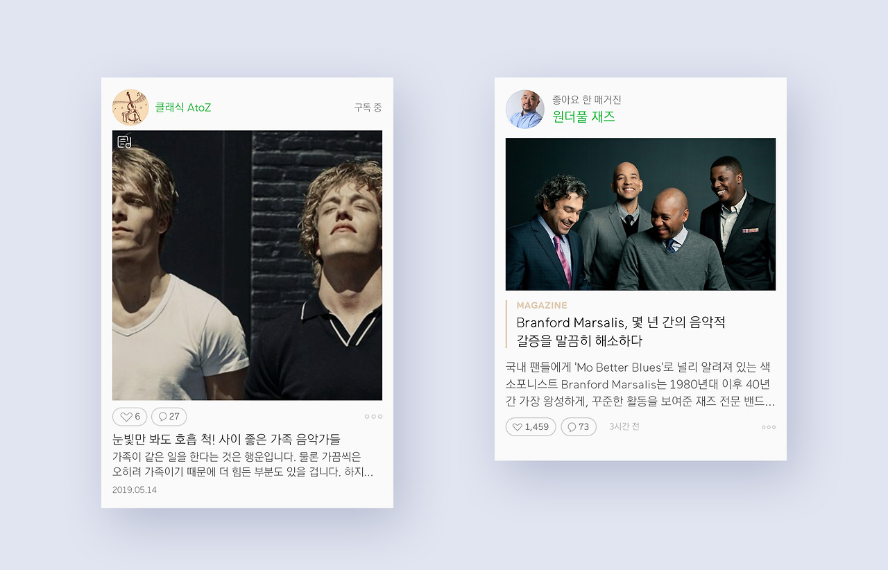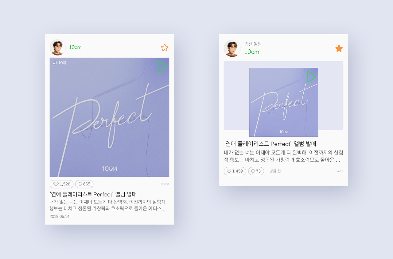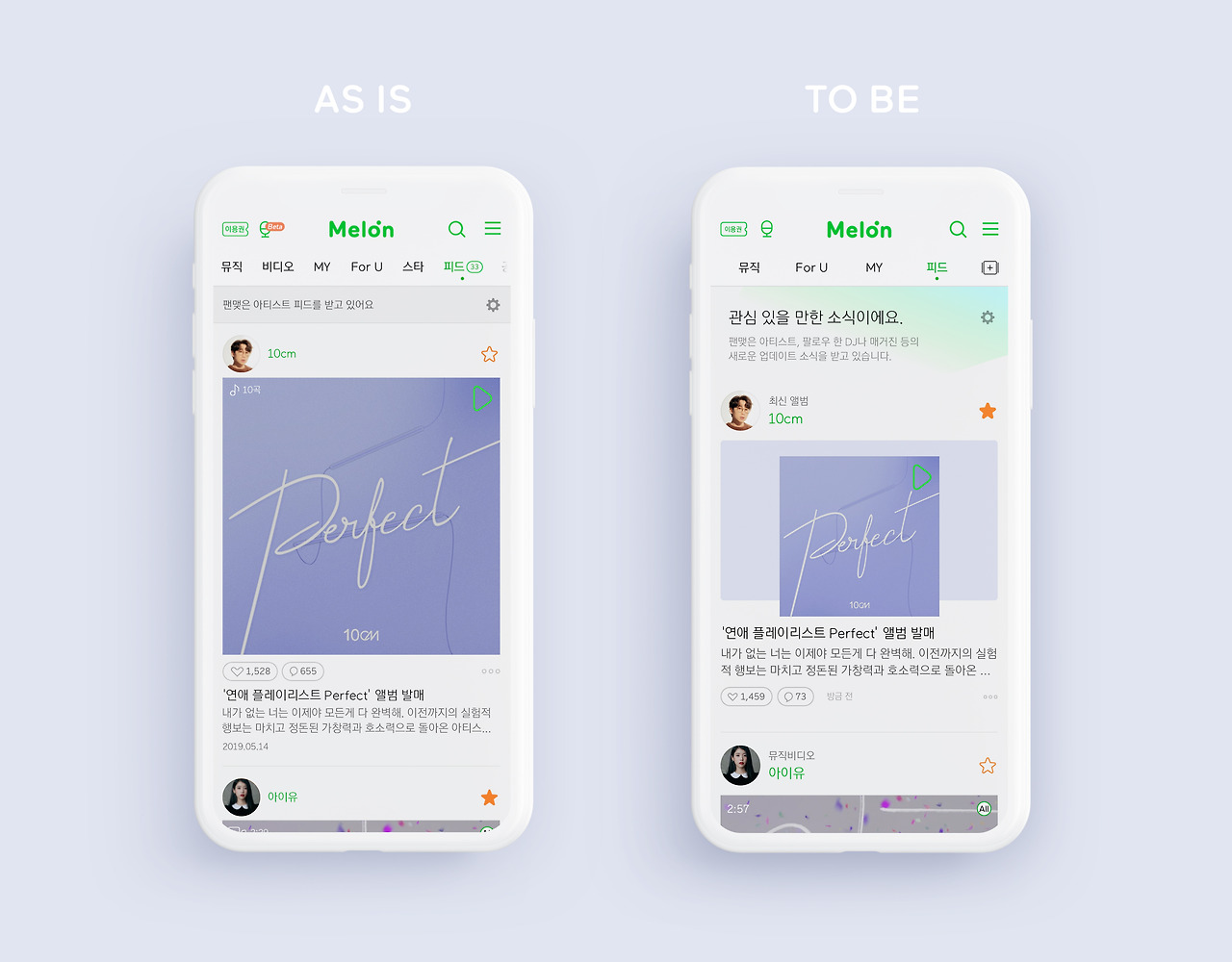개선 전 멜론 4.0 피드 화면을 작업할 때만 해도 2015년이라, 작은 해상도에서 정사각형으로 화면을 채우면 시원해보인다는 기준으로 디자인했습니다. 세월이 흐를수록 디바이스의 크기도 커지고, 정사각형 이미지가 기대보다 크게 노출이 되어 밸런스가 안 맞는 경우가 생겼습니다. 컨텐츠를 비쥬얼 위주로 하나하나 주목시키는 컨셉이라면 크게 채우는 정사각형 스타일도 좋지만, 피드는 적당한 크기의 컨텐츠들로 구성해 다양한 소식을 전달하는 것이 더 중요했습니다. 앨범 커버 썸네일 크기를 줄여 전체적인 밸런스를 맞췄습니다.