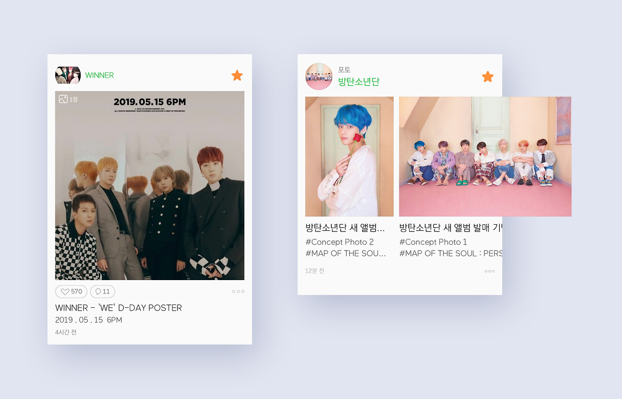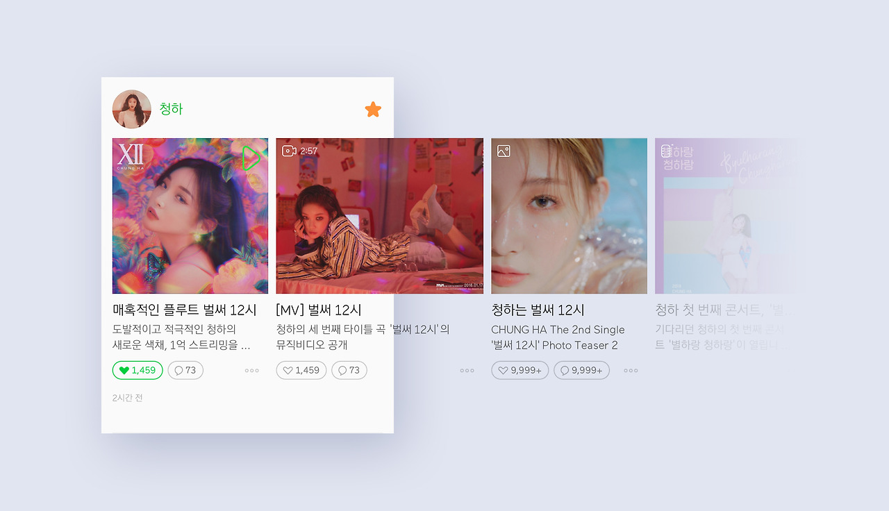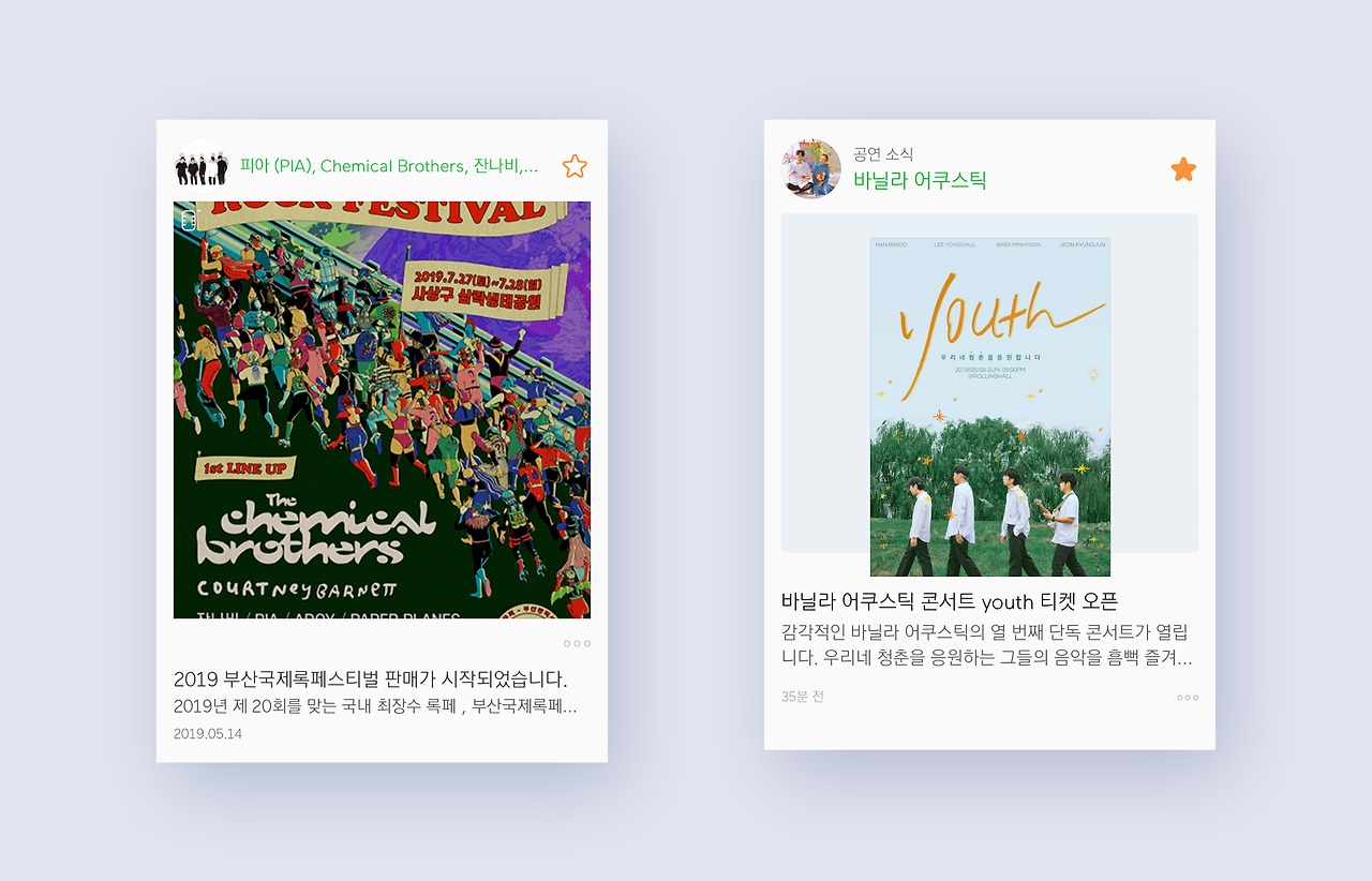 위에서 언급한 묶음 피드입니다. 한 아티스트의 잦은 소식을 알차게 한 공간에서 확인할 수 있도록 컨텐츠를 묶어주니, 피드로 더 다채롭고 유용한 정보를 쉽게 확인할 수 있어졌습니다.