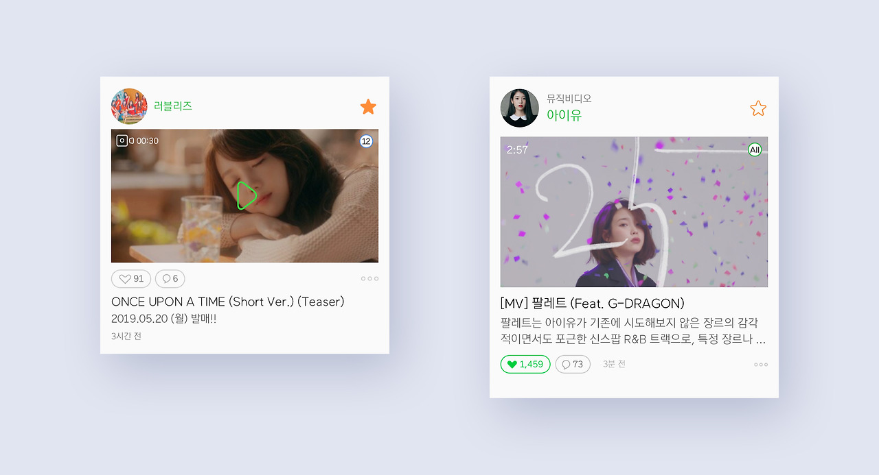 이번 개선에서는 피드를 사용하는 분들에게 좀 더 정보를 컴팩트하게 제공해드리려 했습니다. 동일한 아티스트의피드가 여러번 날아와 스팸성으로 오인할 수 있는 것을 방지하기 위해, 동일한 아티스트의 피드를 묶어 한 공간에서 소비할 수 있게 하고요. 앨범, 비디오, 포토, 매거진, 티켓, 플레이리스트, 라디오 등 각 컨텐츠에 적합한 디자인으로 고도화해 변별력을 명확히 하기로 했습니다. 제목도 서비스에 대한 이해도를 높일 수 있도록 명확하게 크게 달기로 했습니다.