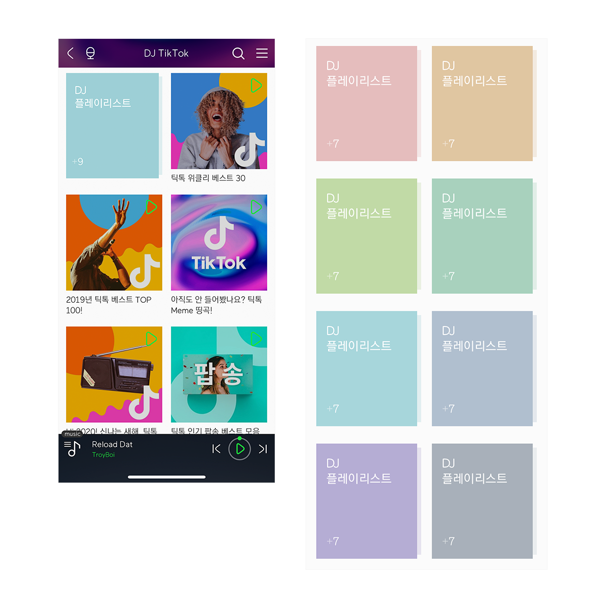 초기안에서는 스크롤을 이용하여 플레이리스트 외 콘텐츠를 보여주려 하였으나 브랜드 특색이 있는 플레이리스트 썸네일을 보는 재미와 더 많은 콘텐츠를 보여주기 위하여 상하 스크롤할 수 있도록 최종안이 변경되었습니다. 비디오도 처음 오픈 시에는 좌우 스크롤이었으나 좀 더 시원하고 넓게 콘텐츠를 보여주고자 수정이 된 부분입니다.