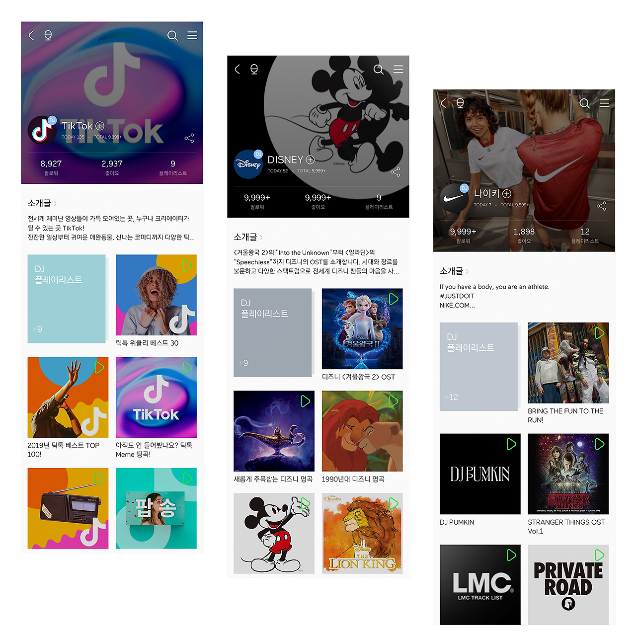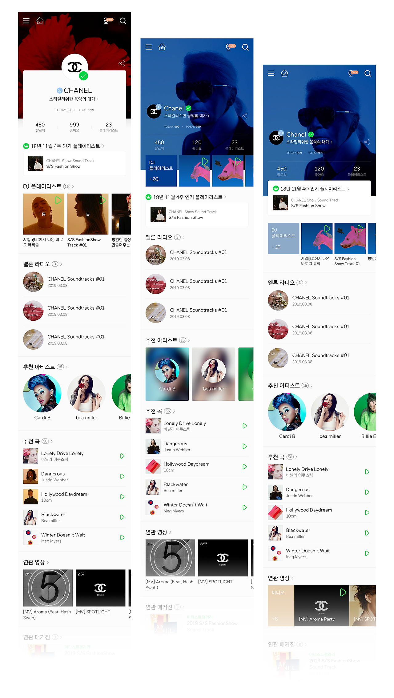 멜론의 타 서비스와는 다르게 브랜드 DJ는 브랜드 관리자가 직접 브랜드 특성에 맞는 배경화면과 플레이리스트 커버를 제작하여 올릴 수 있습니다. 따라서 멜론의 기존 UI는 최소한으로 남겨두되 각각의 브랜드 특색이 잘 보이도록 상단의 이미지를 넓게 사용할 수 있도록 디자인하였습니다. 플레이리스트 썸네일 또한 큼직하고 시원하게 보일 수 있도록 하였고 각 브랜드 플레이리스트의 성격에 따라 타이틀 커버의 컬러를 바꿀 수 있도록 작업하였습니다. 플레이리스트를 제외한 하단 콘텐츠는 라디오, 추천 아티스트, 추천곡, 관련 영상, 매거진 등 브랜드에서 추천하는 콘텐츠만 선택해서 넣을 수 있는데 노출되는 콘텐츠가 적을 때에도 풍성해 보이도록 디자인한 것이 특징입니다.