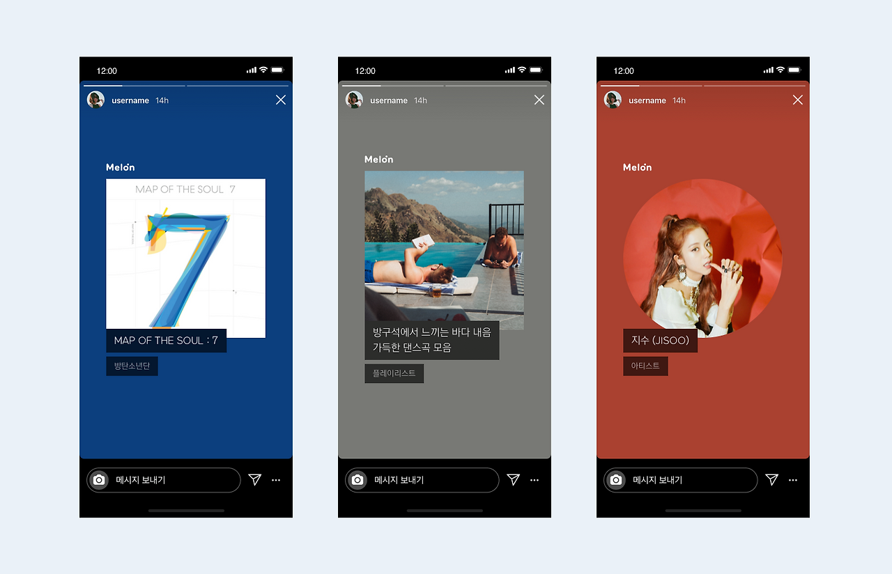 여러분도 듣고 있는 음악을 친구들에게 공유하고 싶을 때가 종종 있으신가요? 저는 그럴 때마다 멜론 플레이어 화면을 캡처해서 인스타그램 스토리에 올리곤 합니다. 그런데 앞으로는 멜론에서 더 쉽고 빠르게 그리고 트렌디하게 곡을 공유할 수가 있게 되었어요. 또한 그 위에 남기고 싶은 메시지를 여러 가지 움직이는 스티커로 감각 있게 표현할 수 있게 되었습니다.