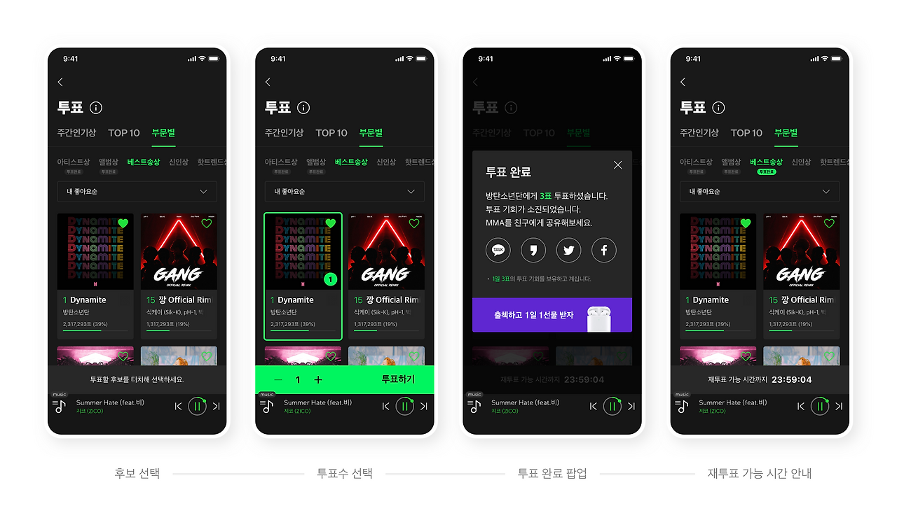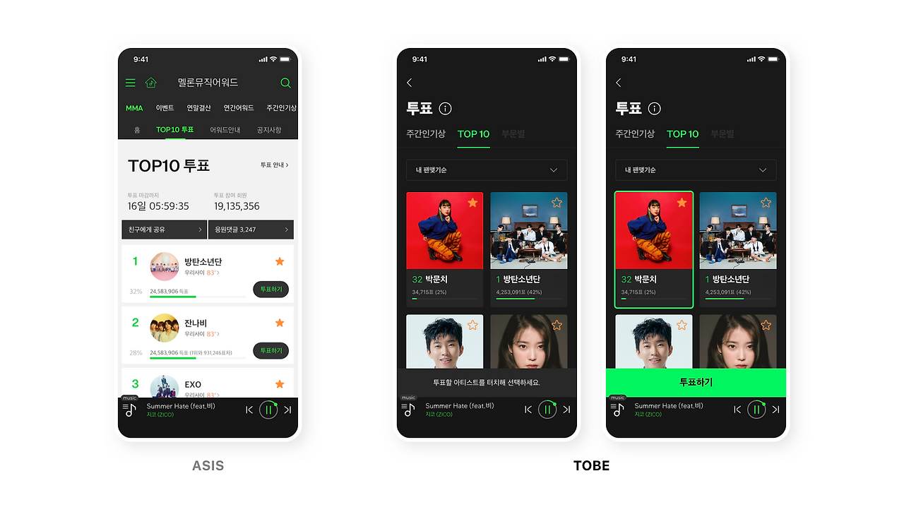 멜론 유료회원은 각 부문마다 하루 3표씩 투표 기회가 있습니다. 기존은 한 번에 1표씩만 투표가 가능해, 여러번 투표를 진행해야하는 번거로움이 있었습니다. 다양한 테스트 끝에 한 번에 3표까지 투표수를 선택해 투표하는 방식으로 프로세스를 개선했습니다. 훨씬 간편하게 투표를 하게 되었고, 실수로 스크롤하다 눌려 투표가 되는 경우도 함께 막게 됐습니다. 이로 인해 의도치 않게 다른 아티스트에게 투표하는 일이 사라져 고객 불편 의견 접수도 거의 없어졌다고 합니다.