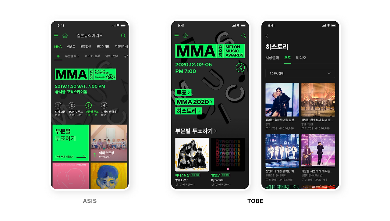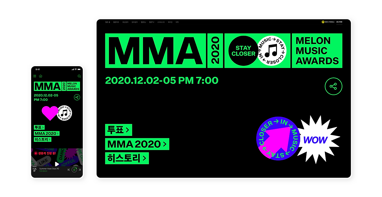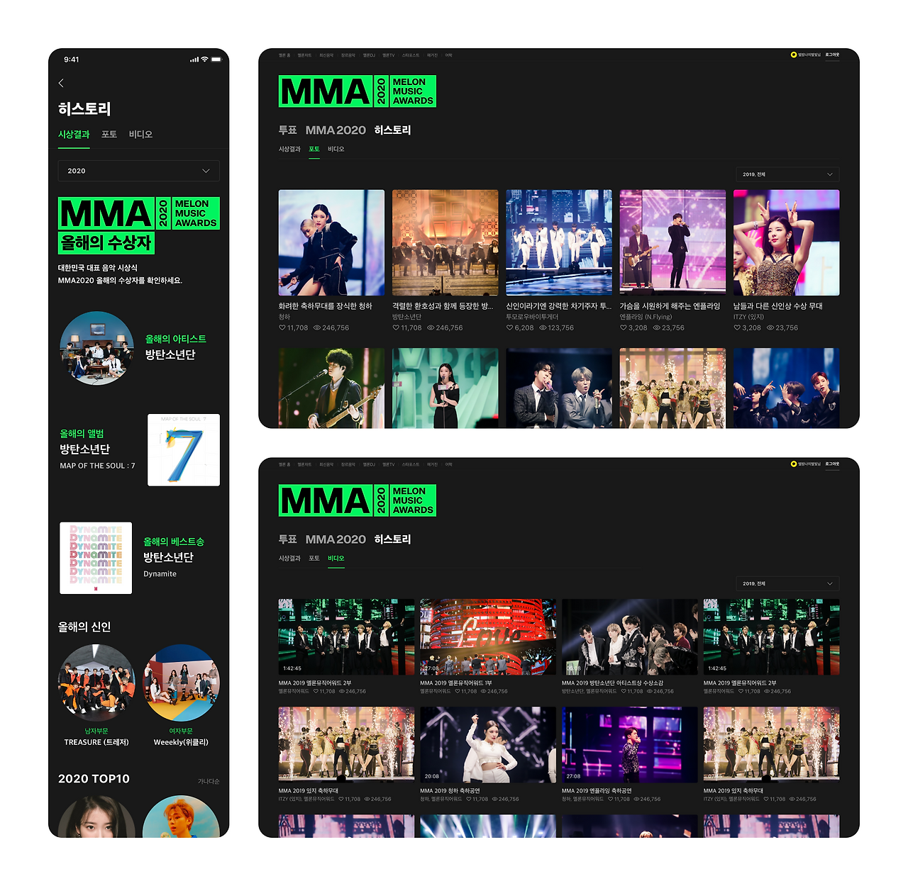 MMA(Melon Music Awards, 멜론 뮤직 어워드, 엠엠에이)는 멜론에서 매년 연말에 진행하는 음악 시상식입니다. 한 해동안 많은 사랑을 받은 아티스트와 음악을 여러분의 투표와 함께 시상합니다. 이번엔 아티스트 뒤에 숨은 공로자들을 찾아 세션, 안무가, 작사/작곡가에게도 트로피를 전달해 더욱 의미 깊었죠. 그동안 오프라인 시상식으로 이어오다 코로나-19로 인해 온라인 행사로 변경, 4일간의 온라인 뮤직 페스티벌 MMA WEEK를 진행했습니다. 온라인으로만 진행되는 만큼 온라인 서비스가 더욱 중요해져 모바일 & PC웹 개편을 진행했습니다.