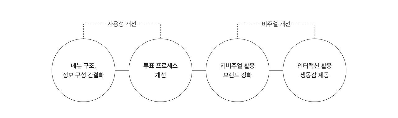 아직 각 분야의 담당자가 TF로 모이기 전, 디자인에서도 올해 개선하고 싶은 포인트를 리스트업하고 아이데이션을 시작했습니다. 리서치하며 인사이트를 얻고, 메뉴 구조를 재배치해보며, 아이디어 스케치로 개선 방향을 잡아나갔죠. 그렇게 TF에서 함께 의견을 나누고, 간결한 메뉴 구조와 구성, 투표 프로세스 개선에 중점을 두고 기획자 분과 함께 고민하고 논의하며 개편을 해나갔습니다.