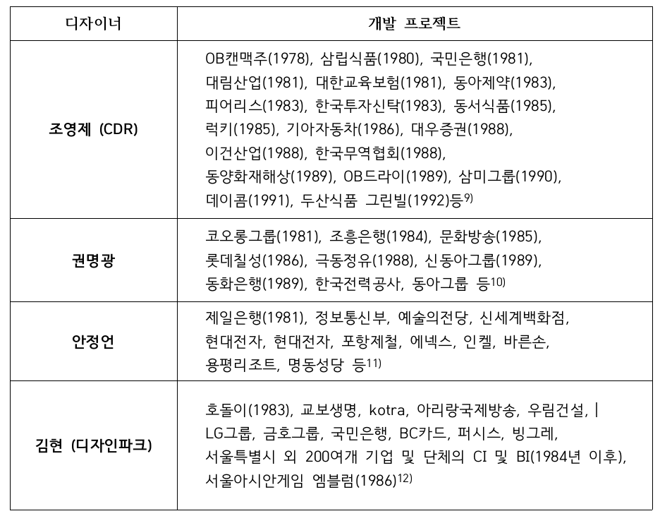 <표 1> 1세대 디자이너들의 주요 브랜딩 개발 프로젝트