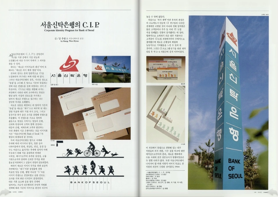 <그림 15> 서울신탁은행의 C.I.P. 개발 소개, 안정언, 1988.당시 CI 개발은 로고타입 디자인뿐 아니라 전용서체, 패키지 디자인, 의상과 차량 디자인 등 다양한 애플리케이션을 개발하고 이것을 규정집으로 제작하여 일관성 있는 디자인으로 관리해야 하는 등 고도로 숙련된 디자이너를 필요로 했기 때문에 몇몇 대학교수와 유명 디자이너들이 주도하였다 <그림 16-18> (조영제는 (전) 서울대학교 교수이며 CDR 대표, 권명광은 (전) 홍익대 총장 (현) 상명대 석좌교수, 안정언은 (전) 숙명여대 교수이며 (전) 올 커뮤니케이션 대표, 김현은 디자인파크 대표이다). <표 1>