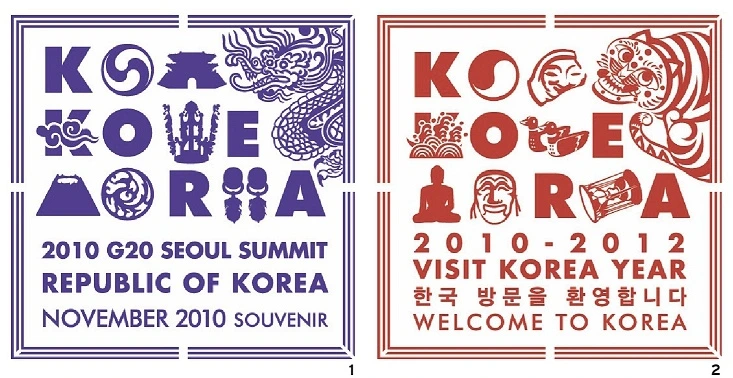 <그림 42> G20 Seou Summit 2010 엠블렘, 2010. <그림 43> 2010 한국 방문의 해 스템프 디자인, 2010.