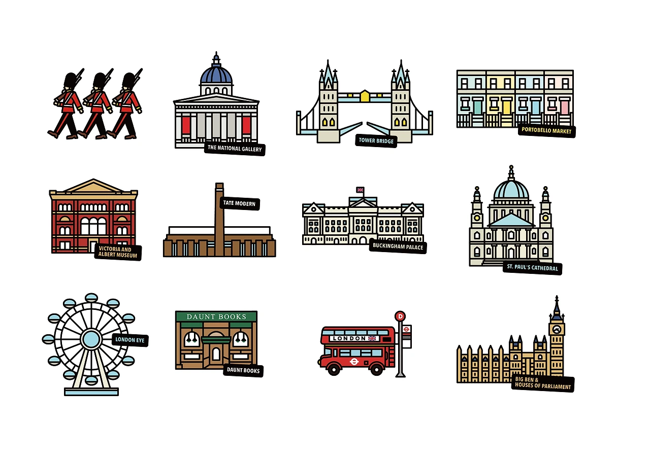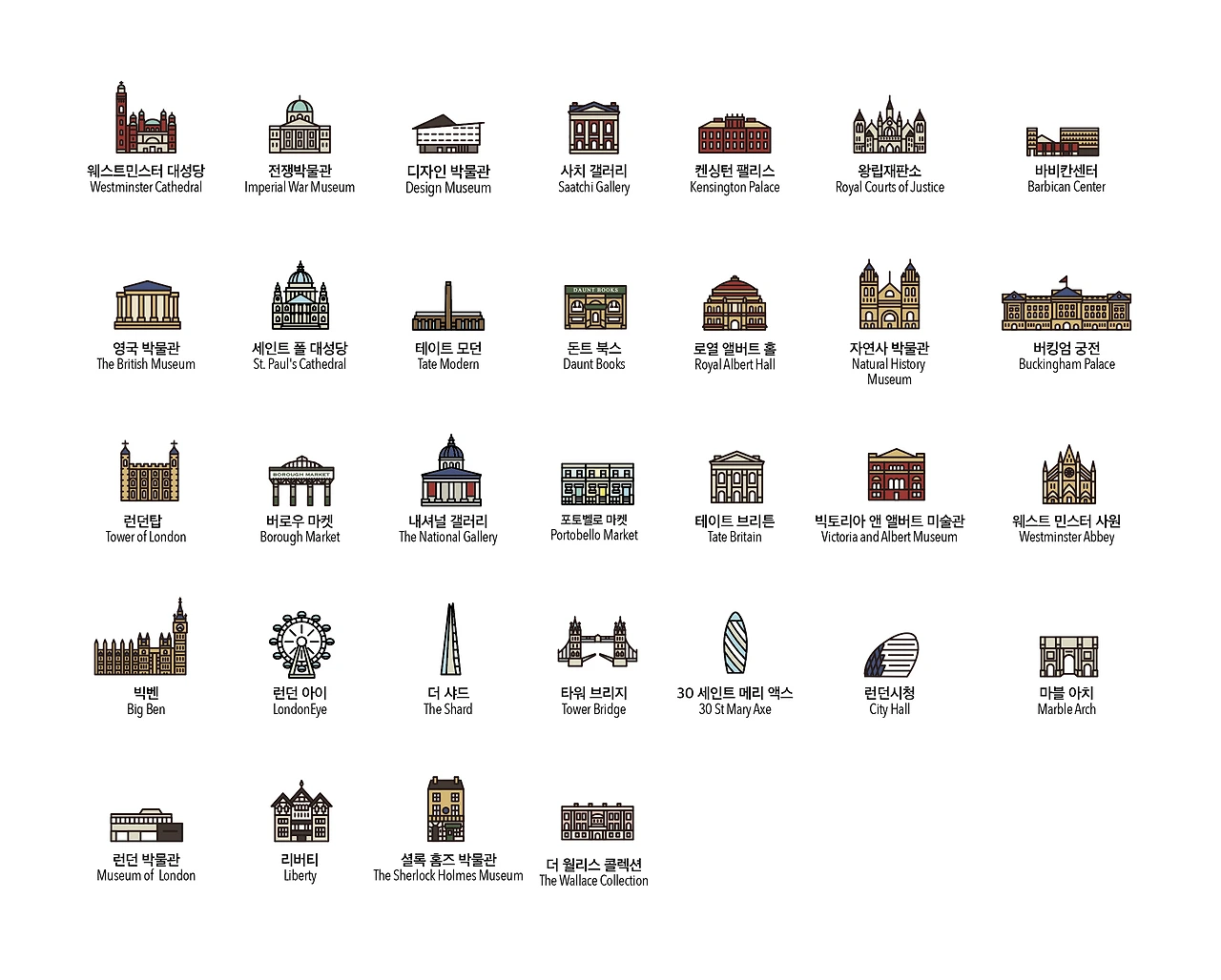 지도에 들어갔던 32개의 런던 명소 아이콘, 그리고 스티커 작업으로 추려낸 아이콘들