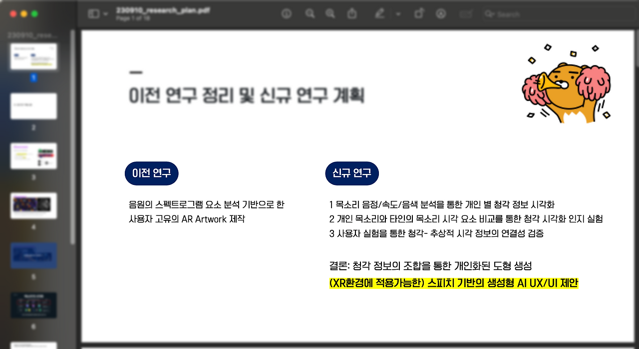 그 과정에서 이 연구를 사업아이템의 시각으로 바라보고 굉장히 구체적인 자문을 해주신 선배님이 계셨다. 지금 다시 생각해도 감사한 분이시다. 이전 회사에서 업무를 하다가 짧게 뵌 타사업부 선배인데도 불구하고 직급과 관계없이 나에게 편하게 대해주셔서 지속적으로 연락을 하고 지냈었는데, 사운드 분야의 전문가로서 퇴사한 후배인 나에게 아낌없는 피드백을 주셔서 빠르게 기획을 구체화 할 수 있었다.