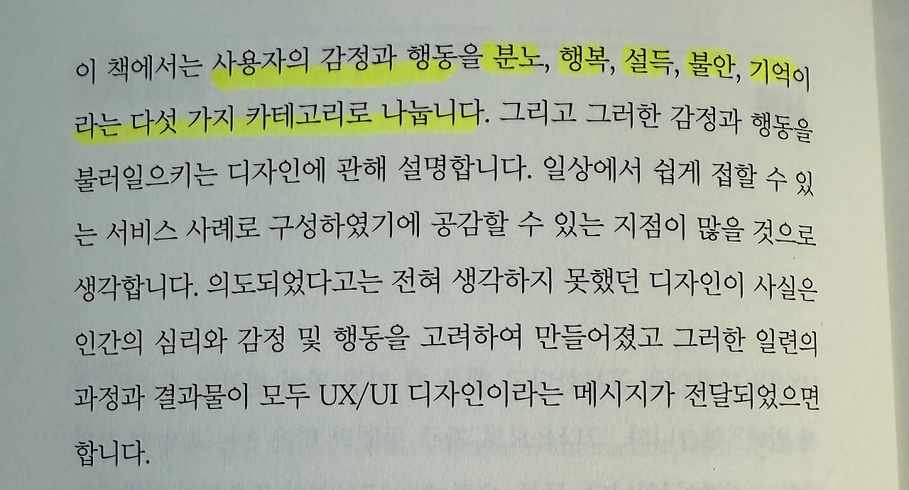 저자는 인간의 감정과 행동을 다섯 가지로 분류합니다. ‘분노, 행복, 설득, 불안, 기억’ 그리고 각 감정에 대응하는 실제 서비스 사례를 통해, ‘심리학이 UX의 기초 언어’임을 차분히 증명합니다.