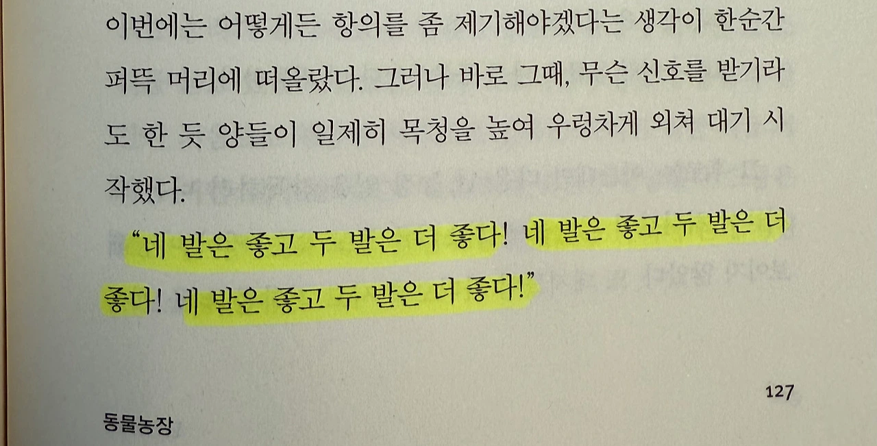 처음에는 “네 발은 좋고 두 발은 나쁘다”로 외치던 구호가, “네 발은 좋고 두 발은 더 좋다”로 바뀝니다.