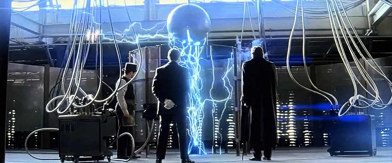 크리스토퍼 놀란의 〈프레스티지〉에서도 비슷한 흐름이 이어집니다. 테슬라의 전류 장치는 번개처럼 튀며 ‘창조’와 ‘복제’의 힘을 부여합니다. 프랑켄슈타인이 번개로 생명을 얻었다면, 〈프레스티지〉의 엔지어(휴 잭맨)는 전기로 자신을 무한 복제합니다. 기술이 인간의 욕망을 대신 수행하고, 때로는 너무 충실하게 수행하는 장면입니다.