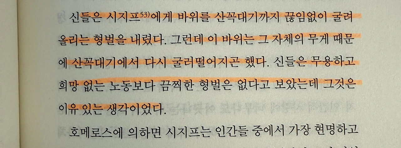 알베르 카뮈의 『시지프 신화』에서, 신들은 시지프에게 바위를 산 위로 끊임없이 굴려 올리는 형벌을 주었습니다. 올려놓을 때마다 다시 굴러떨어지는 반복. 비극은 노동 그 자체가 아니라, 그 반복을 ‘의식하며’ 견뎌야 한다는 데 있습니다.