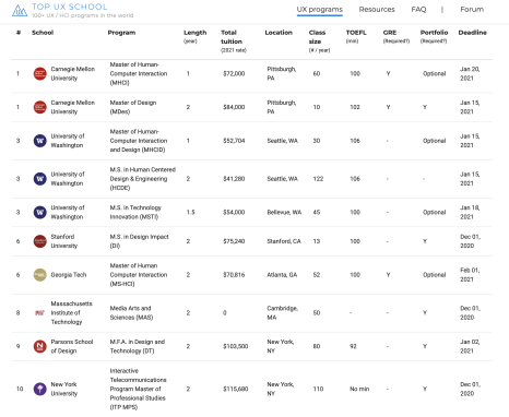 보통 HCI/UX/Interaction Design 쪽 학교를 결정할때 가장 많이 참고하는 곳이 https://www.topuxschool.com/program/us 이곳이다.