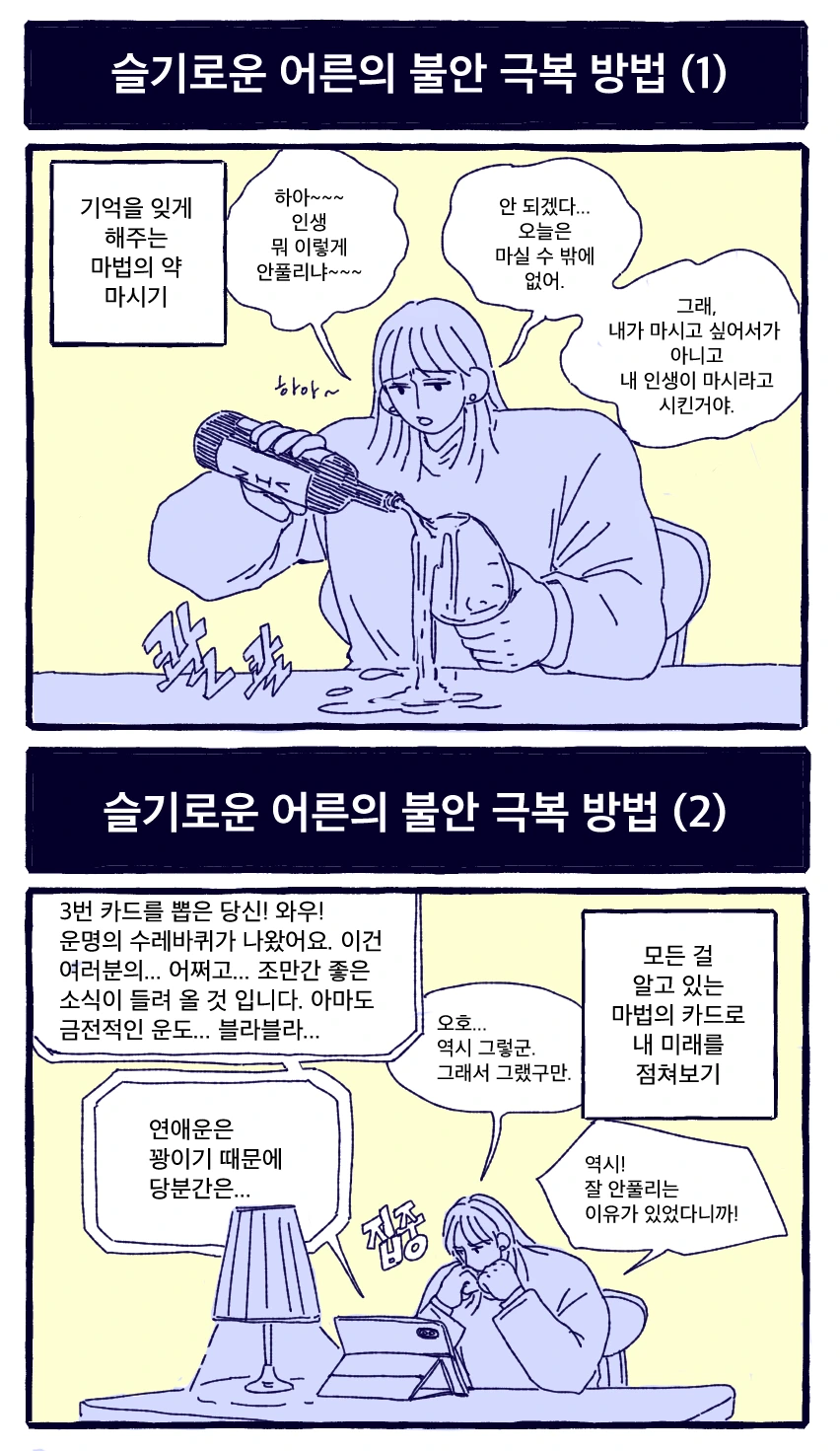 그러나 당장 나를 뽑아 달라고 하기엔 내가 가진 것이 별로 없었다. 제대로 정리된 포트폴리오도 없었고, 혼자 끼적댔던 작업들은 너무 다양한 분야로 뻗어 있었다. 그래도 언제나 목적 달성을 위해 고 스트레잇 직진만을 고수하는 나는 간절함을 담아 최대한 모든 것을 끌어 모았다. 저, 영상 쪽 일도 가능합니다. 소소한 어필도 했다. 그렇게 두 번째 면접을 보던 날, 나는 자리를 파하며 꼭 나를 채용하지 않아도 된다고 덤덤하게 말하고 나왔지만 밤마다 유튜브에서 타로 카드 영상을 틀어 놓고 내 운명을 점쳤다. 사건이 해결되면서 돈이 들어온다는데, 그럼 일하게 되는 거 아니야? 그러면 좋겠다. 진짜, 제발요!
