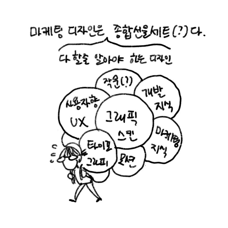 이전의 브런치 글들에서도 여러 번 언급했지만, 마케팅 디자인은 단순한 디자인이 아니며 꽤 여러 분야에 대해 다양하게 알아야 한다. 주니어 시절에는 이렇게 다 알아야 한다는 것이 너무 머리가 아팠는데, 지금 생각하면 학생 시절이나 사회 초년생 시절 그저 스쳐 지나가면서 배웠던 관련 지식들이 일할 때 큰 도움이 되었다. 내가 마케팅 디자인을 해보다가 UX 공부를 더 하다가 프로덕트 디자인으로 전향할 수도 있고, 페이지 문구나 알림 창 문구를 고민하다가 UX라이터로 전향할 수도 있다. 마케팅 디자인은 계속 들어다 볼수록 하이브리드(hybrid) 디자인 영역 같다. 되게 단순해 보이지만 그 안에 매우 다양한 영역의 지식을 요구한다. 그래서 마케팅 디자인은 더 매력적인 디자인이다.