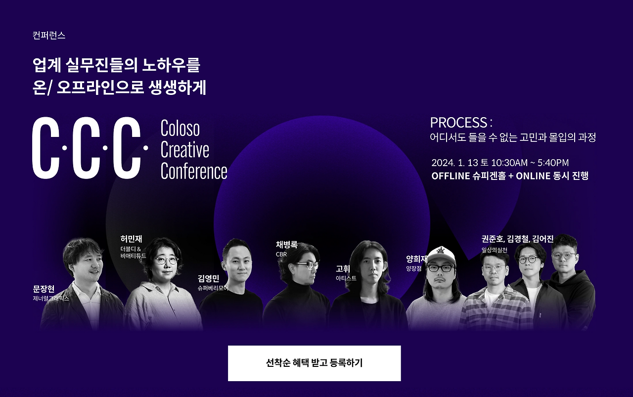 올해 첫 글은 새해의 결심을 이루고자 연말에 후다닥 결제한 콜로소 크리에이티브 컨퍼런스(C.C.C 2024) 후기를 가져왔다. 컨퍼런스는 1월 13일(토)에 진행되었으며, 내가 결제할 때 즈음에는 오프라인 참여 티켓은 모두 매진돼서 온라인으로 컨퍼런스에 참석했다. 여러 분야에서 활동하는 디자이너 또는 아티스트가 각 세션별로 다양한 주제에 대한 이야기를 들려줬는데, 내가 일하는 필드가 아닌 다른 분야의 이야기에서도 많이 공감하고 여러 인사이트를 얻을 수 있었다.
