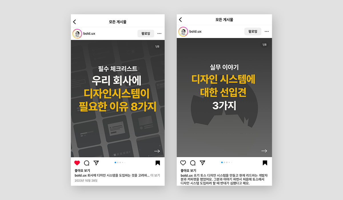 나는 마케팅 디자인 시스템을 구축하면서 위의 2가지의 문제를 제일 많이 고민했다. 시스템을 만들기 전에도 고민을 많이 했던 사항으로, 만약에 업무 효율화를 진행하려는 디자이너가 있다면 이런 고민을 해보길 바란다. 위의 문제들을 압축해서 얘기하자면, [정형화된 가이드에 빠져서 기존의 디자인 스타일을 잊어버리는 것]을 주의해야 한다. 결국 우리는 심미성을 놓치면 안 되는 [디자이너]이기 때문에 이 심미성을 위한 요소를 완전히 배제하면 안 된다.(아니, 디자인하다 보면 심미성을 배제할수 없을 것이다)